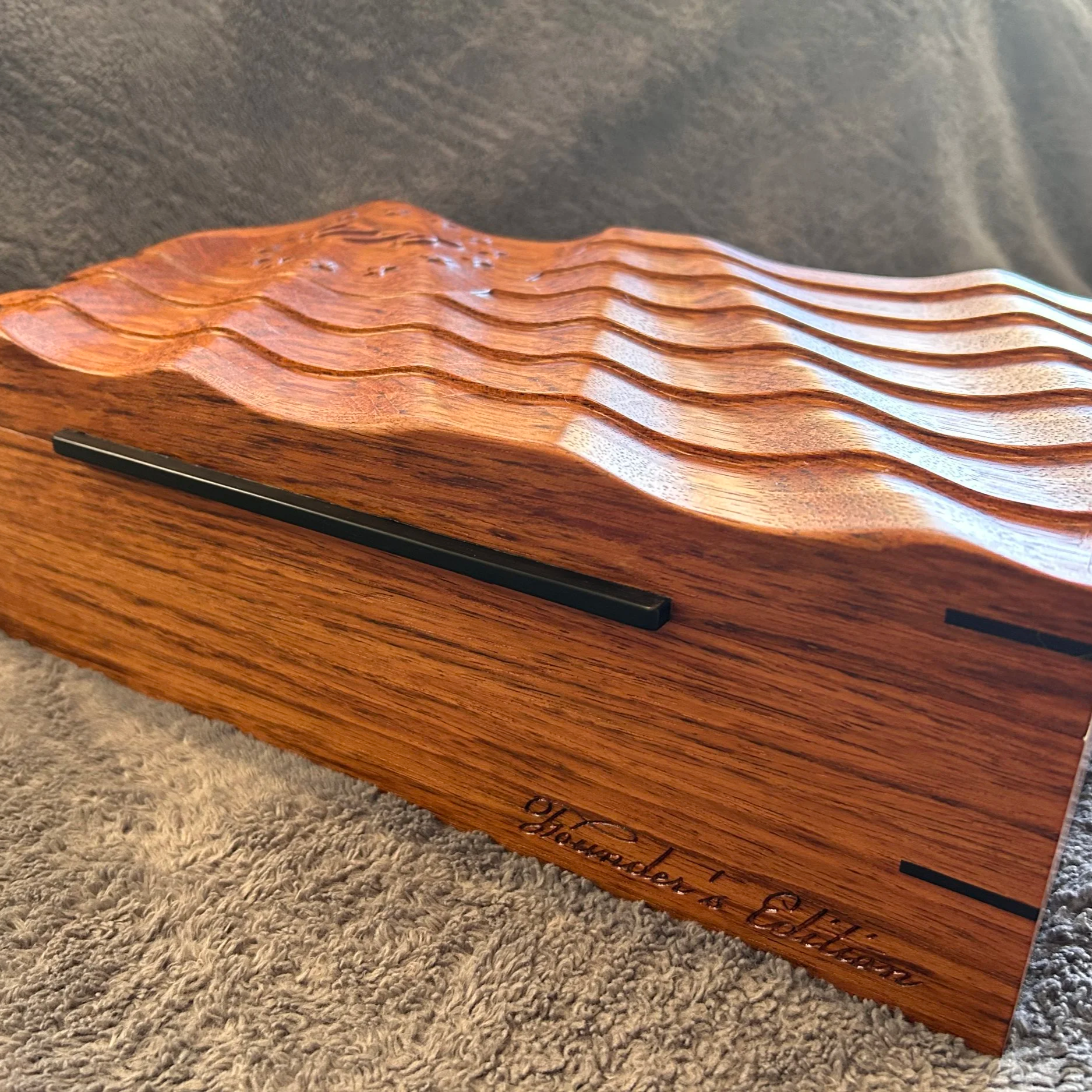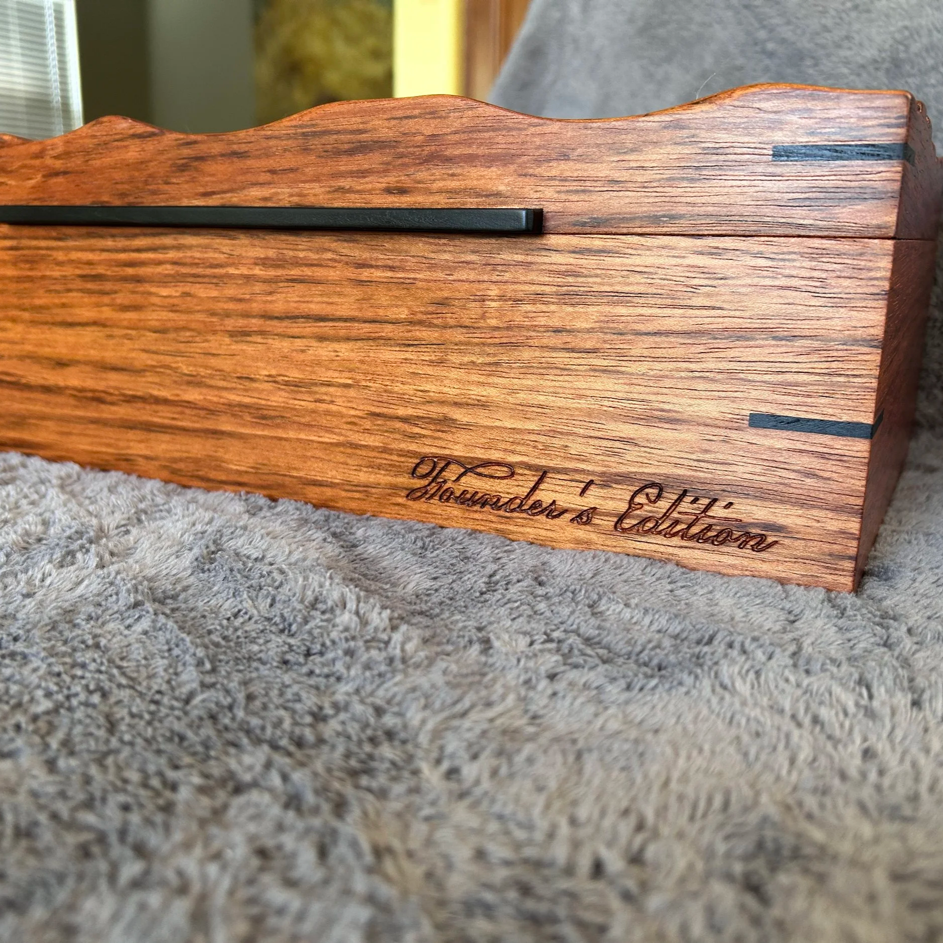 Crafted of Jatoba hardwood with Ebony accents and lined with Spanish Cedar. The lid is carved with the Betsy Ross flag and the year 1776, while the front of the box is engraved with the Founder's Edition tag in early American script.