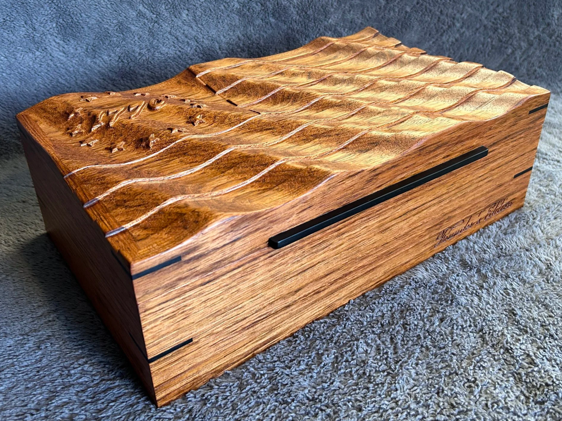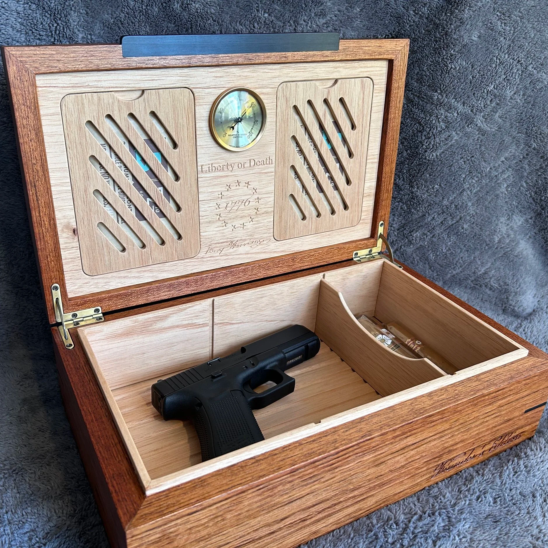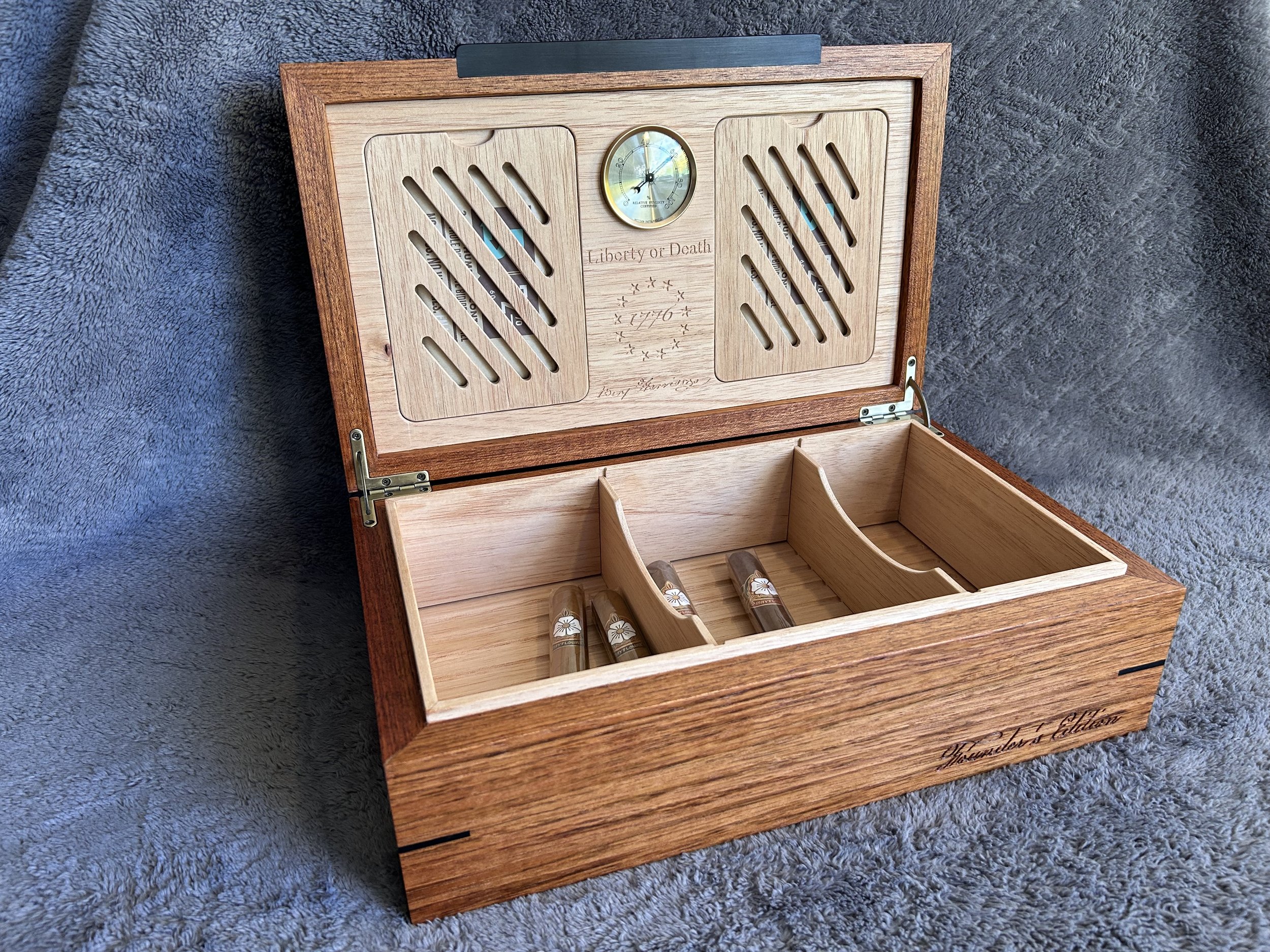 The inside of the humidor is engraved with Benjamin Harrison's signature from the Declaration of Independence. I would consider making additional boxes with signatures of other Founding Fathers if there's interest.