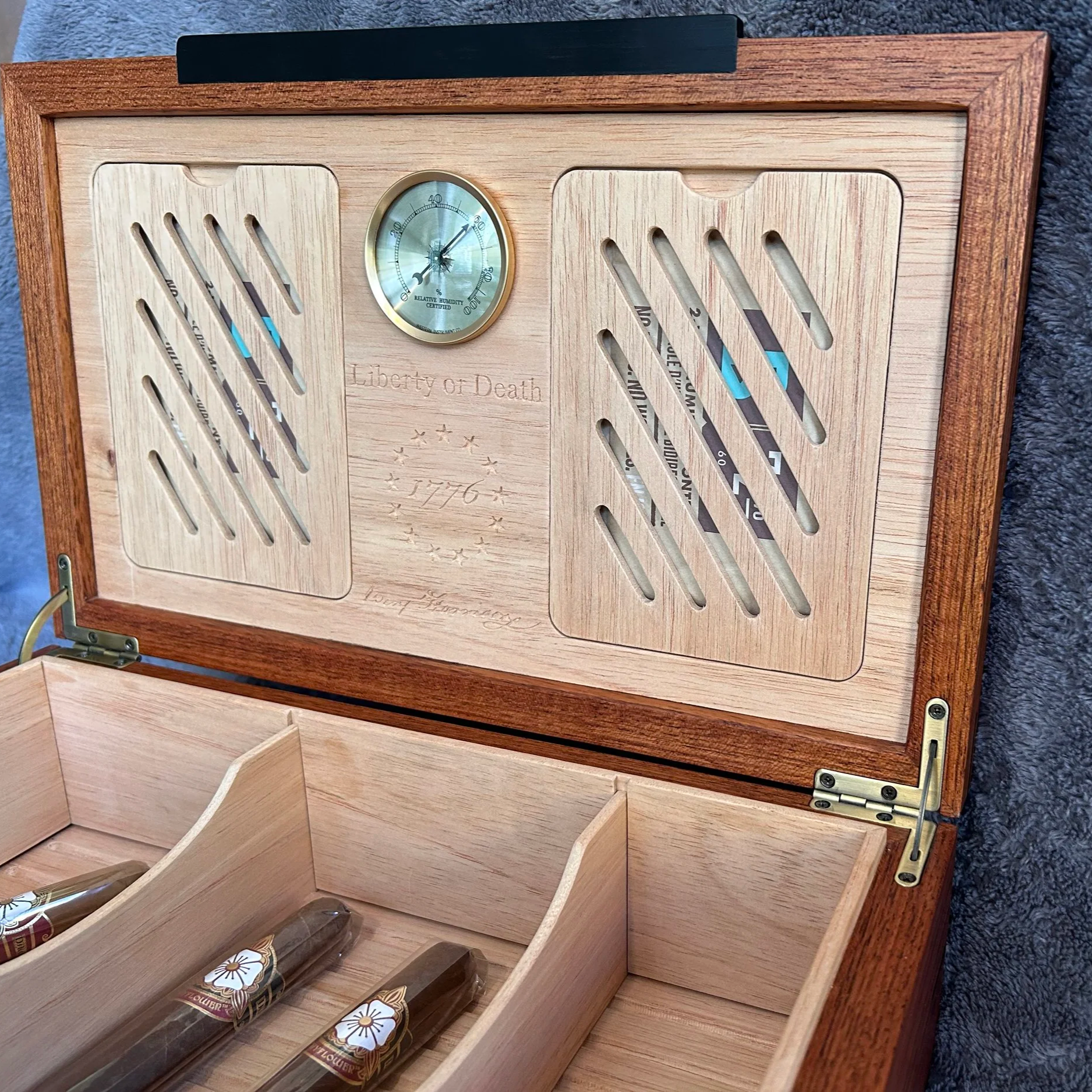 The inside of the lid is carved with the 1776 tag, 13 stars representing the original 13 colonies, "Liberty or Death," as well as Benjamin Harrison's signature from the Declaration of Independence.