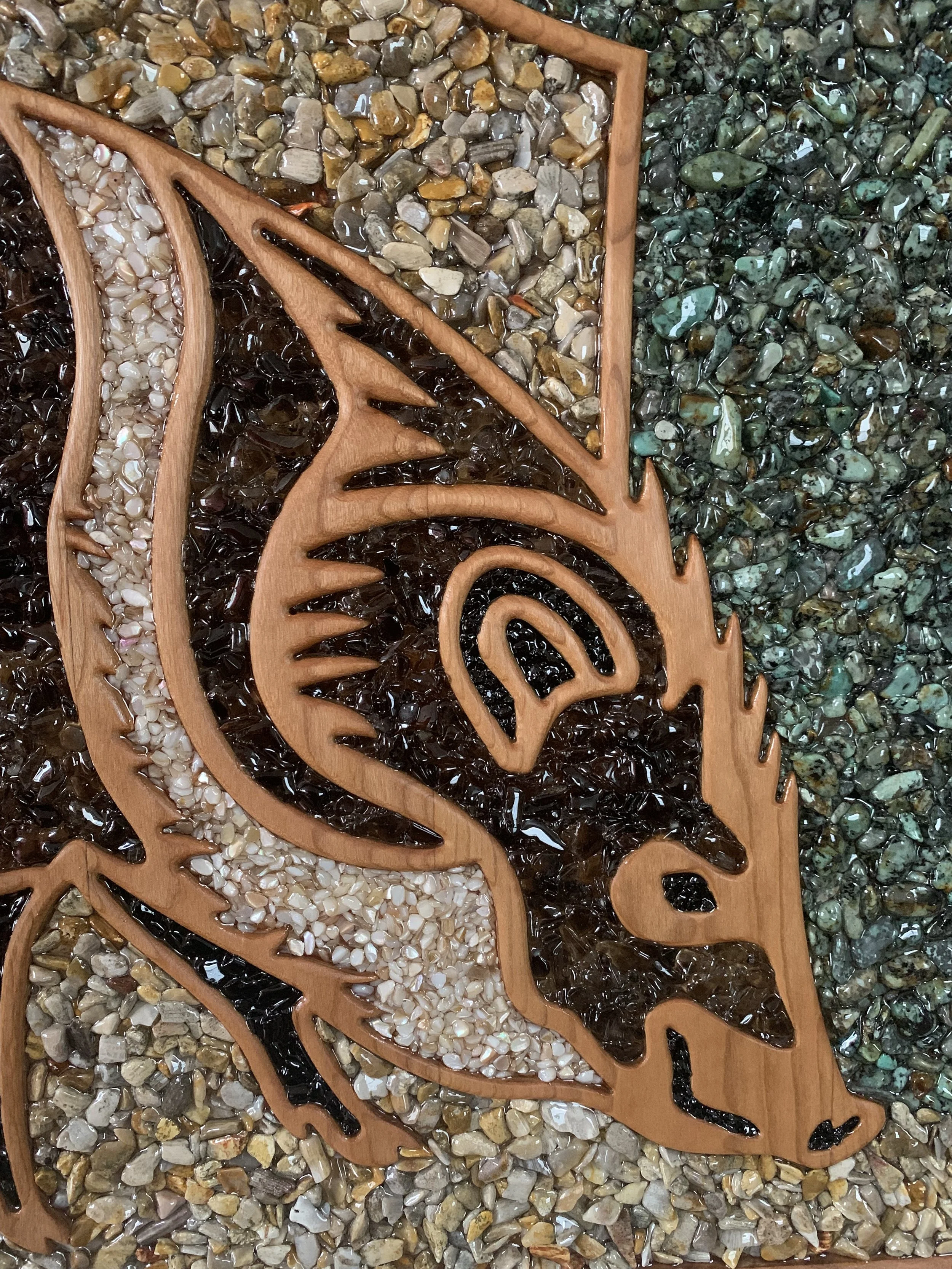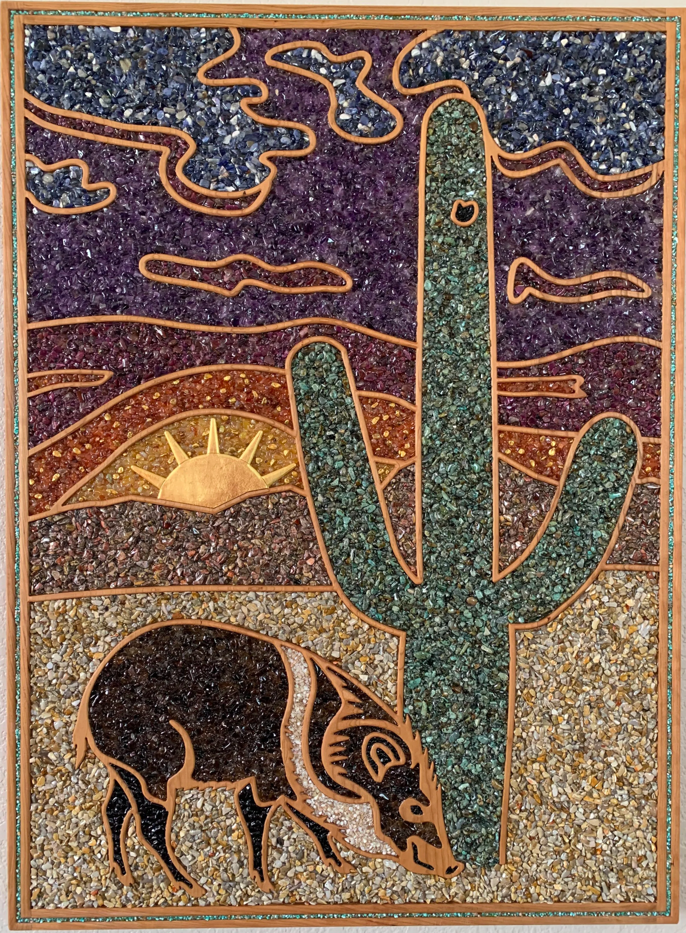 Carved in premium Cherry hardwood and inlaid with semi-precious stone set in casting resin, this piece is a tribute to the truly magical Sonoran Desert.