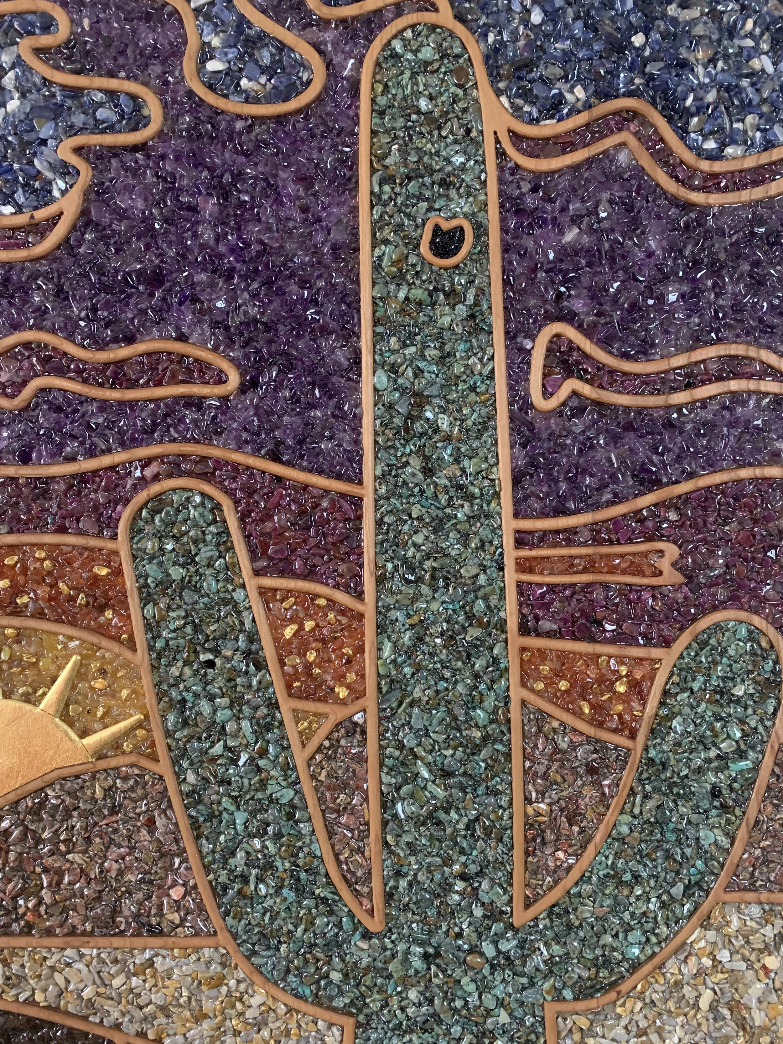 The sun and rays are gilded with 99.9% pure 24K triple gold leaf. I applied gold leaf to some of the Carnelian and Yellow Agate, which I then lightly sprinkled into the yellow and orange portions of the sunset to add highlight.