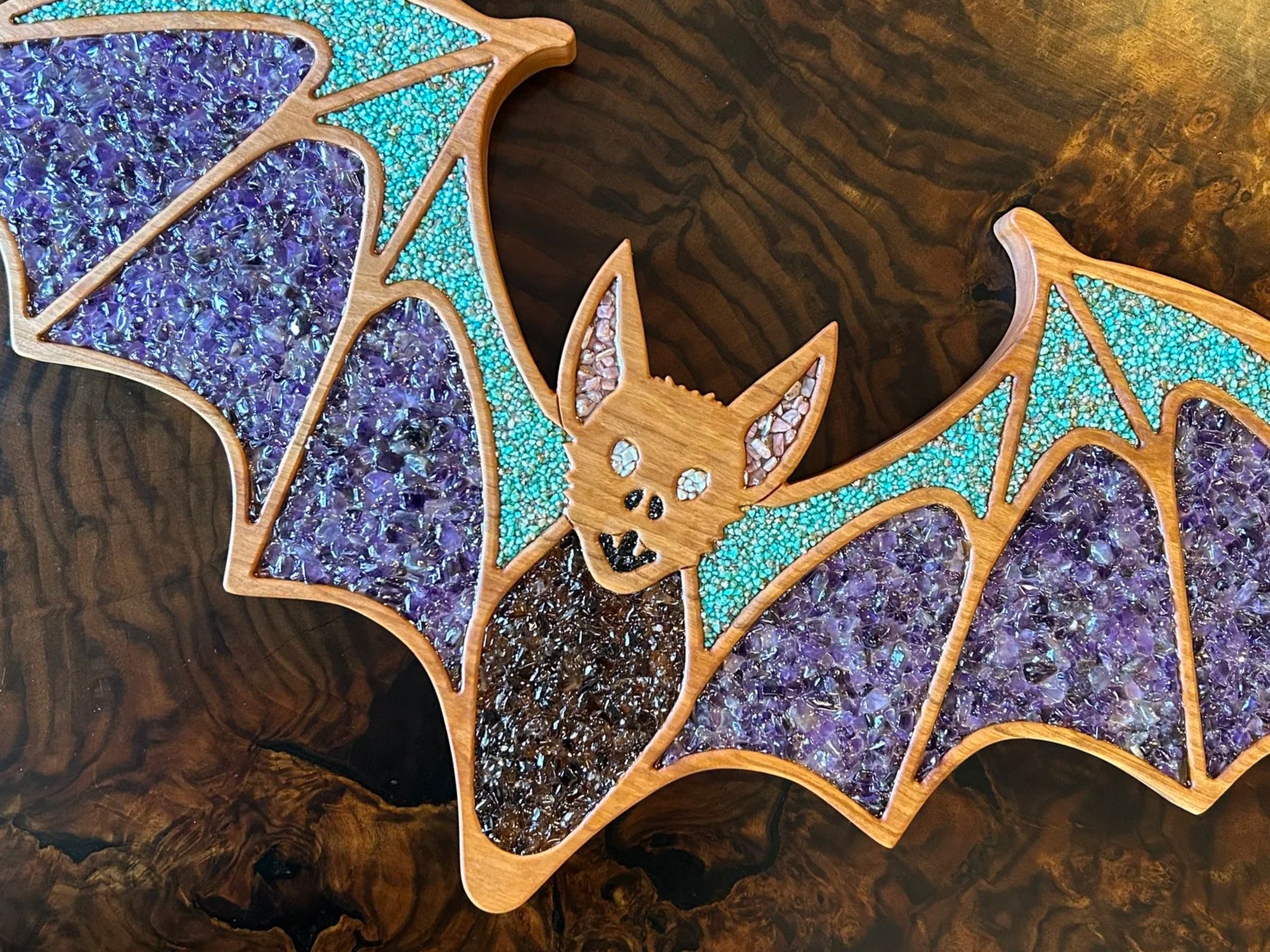 This piece is made of Cherry hardwood with Amethyst, Campitos Turquoise, Howllite, Smokey Quartz and Rhodochrosite. It measures at 27 3/8" x 12 15/16" and is 1 1/16" thick.