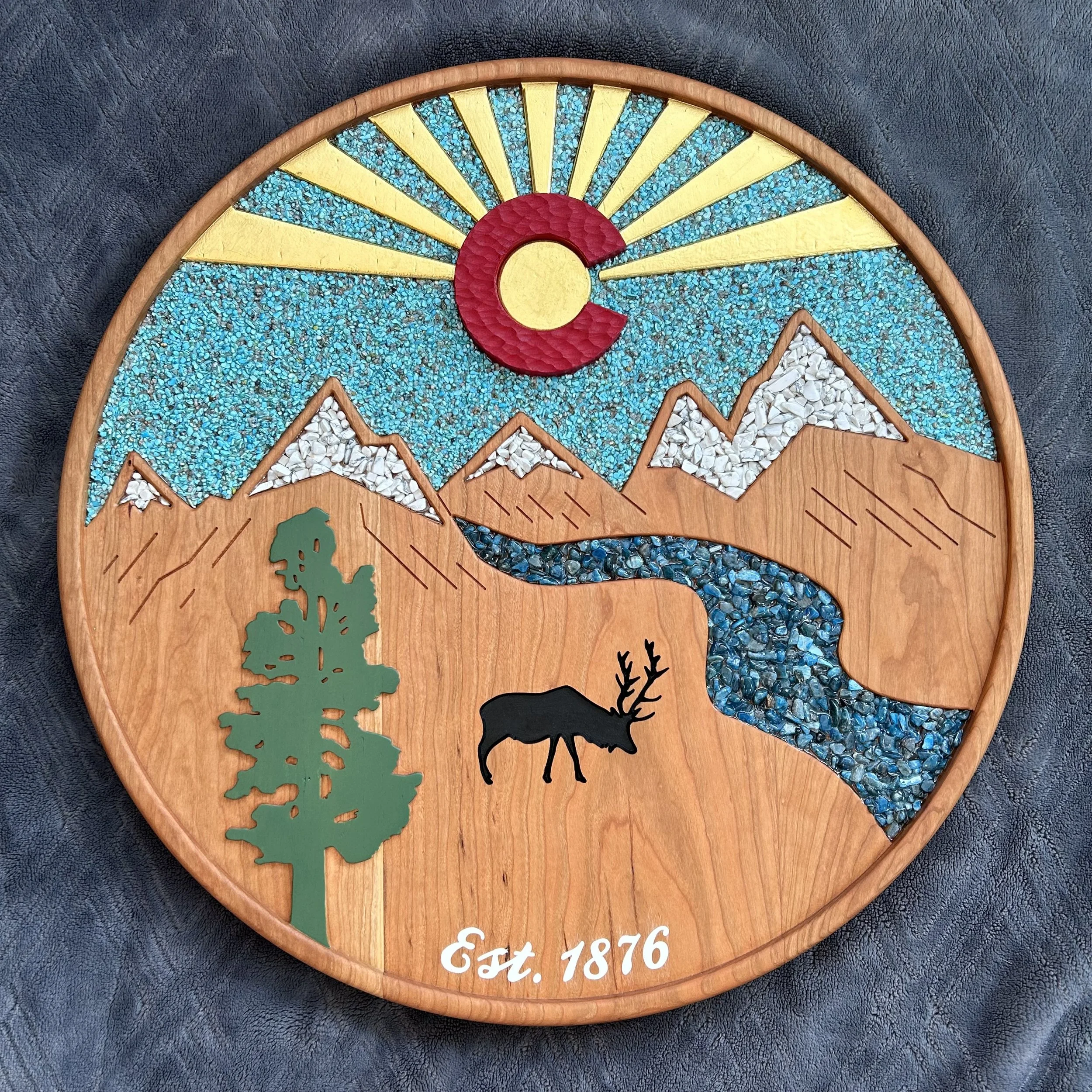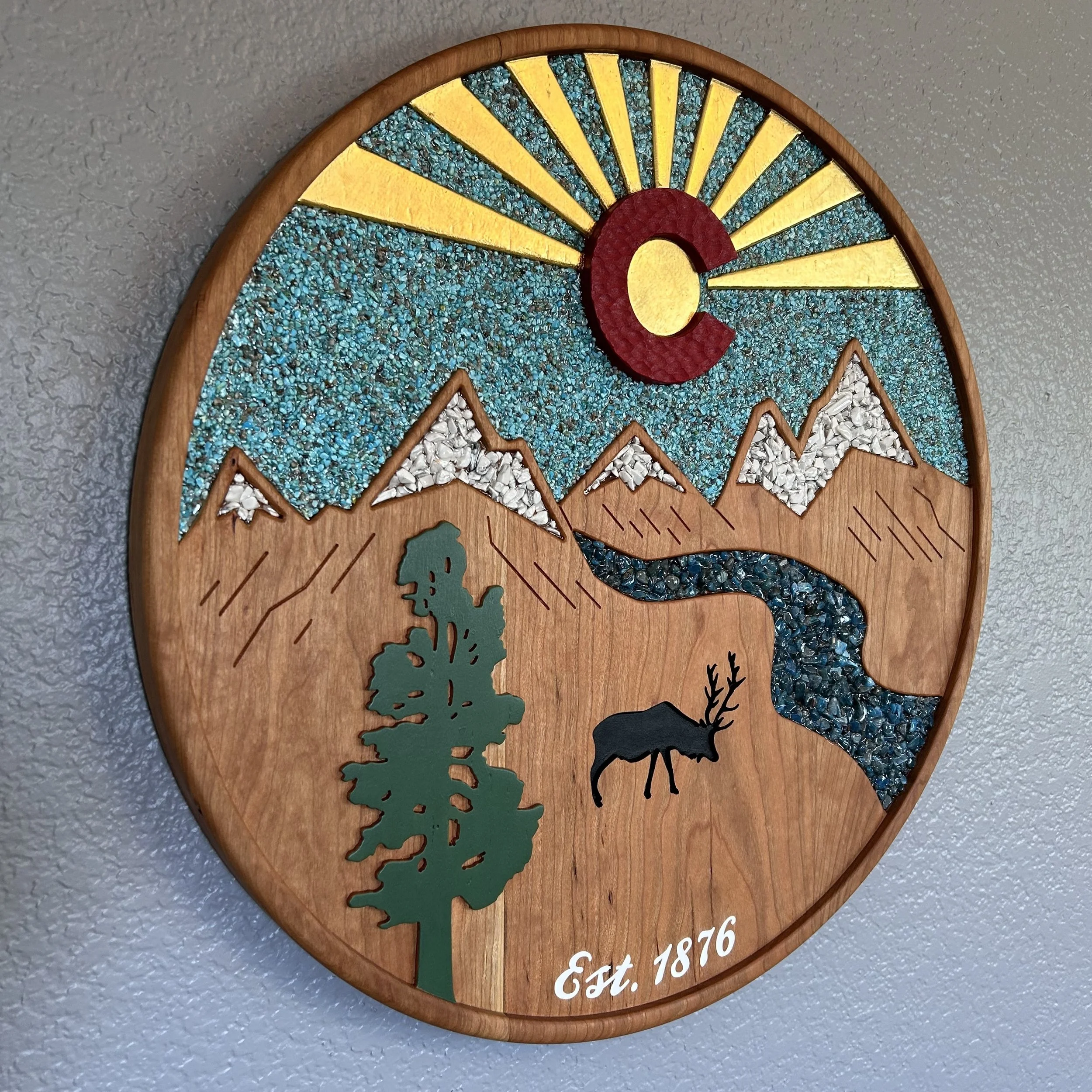 The blue sky is inlaid with beautiful Sleeping Beauty turquoise that comes from the Sleeping Beauty mine outside of Globe, Arizona. The snow-capped mountains are inlaid with Howlite, while the blue river is inlaid with Blue Apatite. The bottom text is carved and filled with white resin. The Colorado C, tree and elk are painted with acrylic paint. The sun and rays are gilded with 24K triple gold leaf, which makes a bold statement in any space.