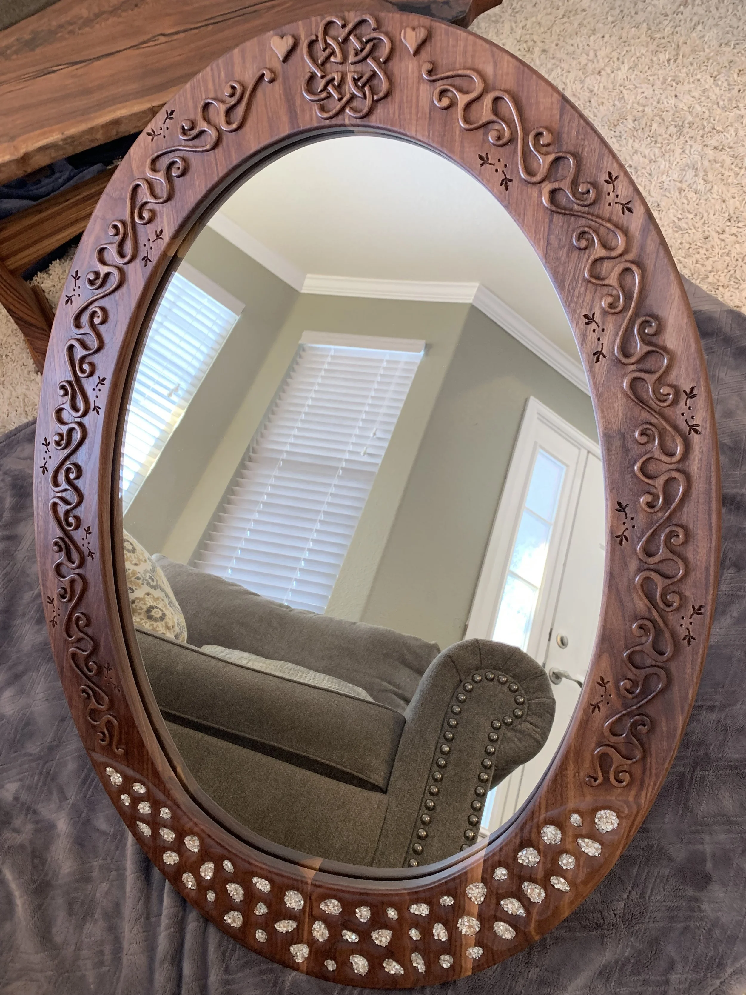 I made this large, custom-designed and carved mirror for my 9 year-old daughter. Carved of premium American Walnut, the frame measures 31" wide, 43" tall and 1.32" thick. It's a nice, large size, hanged at the perfect height to be used as a full-body mirror.