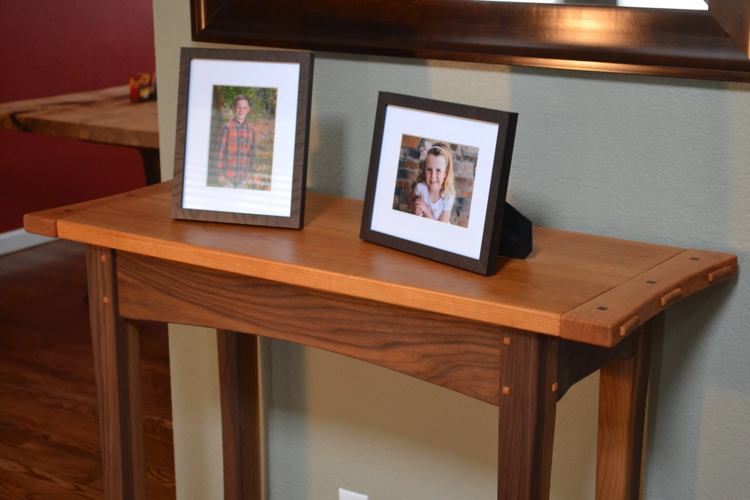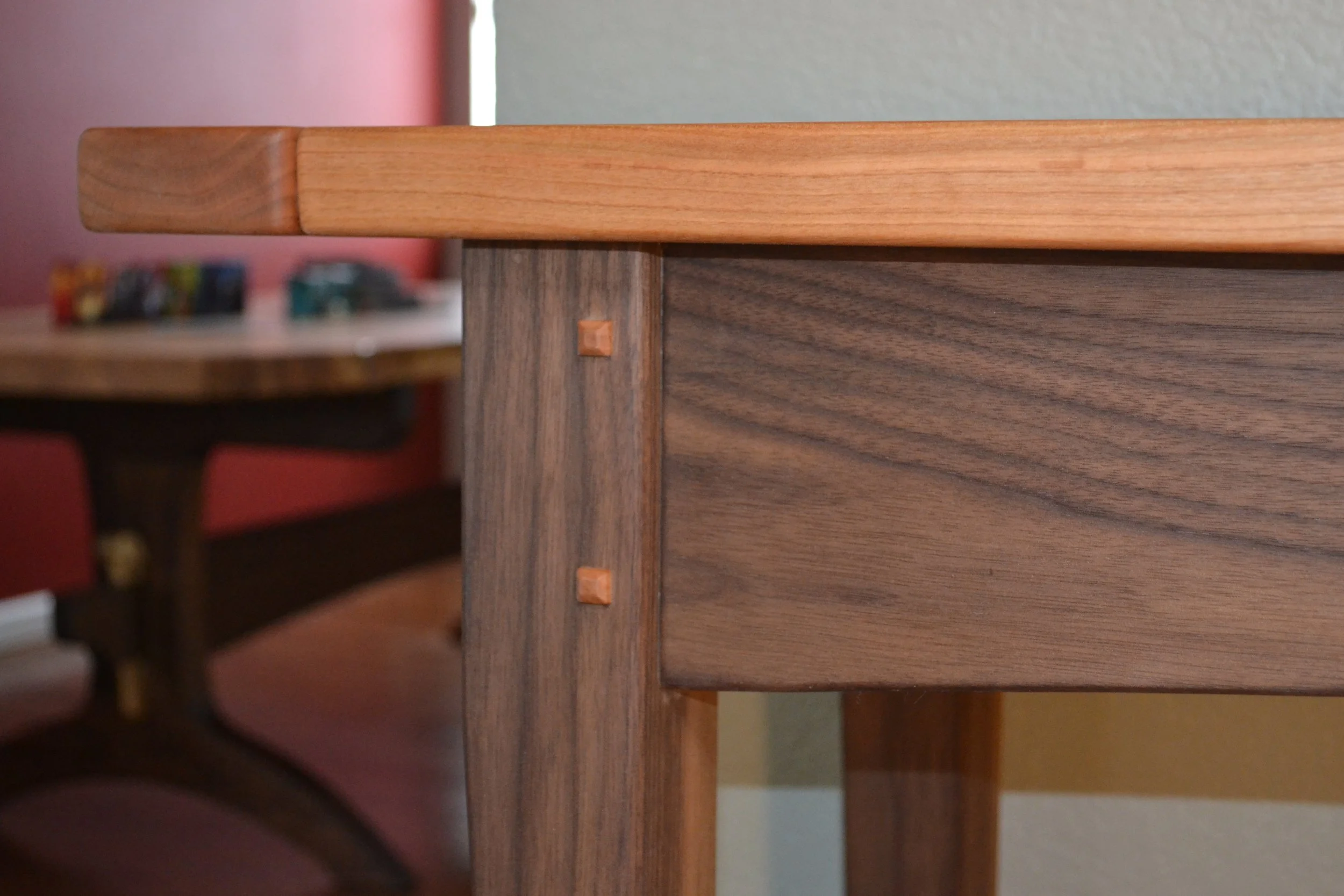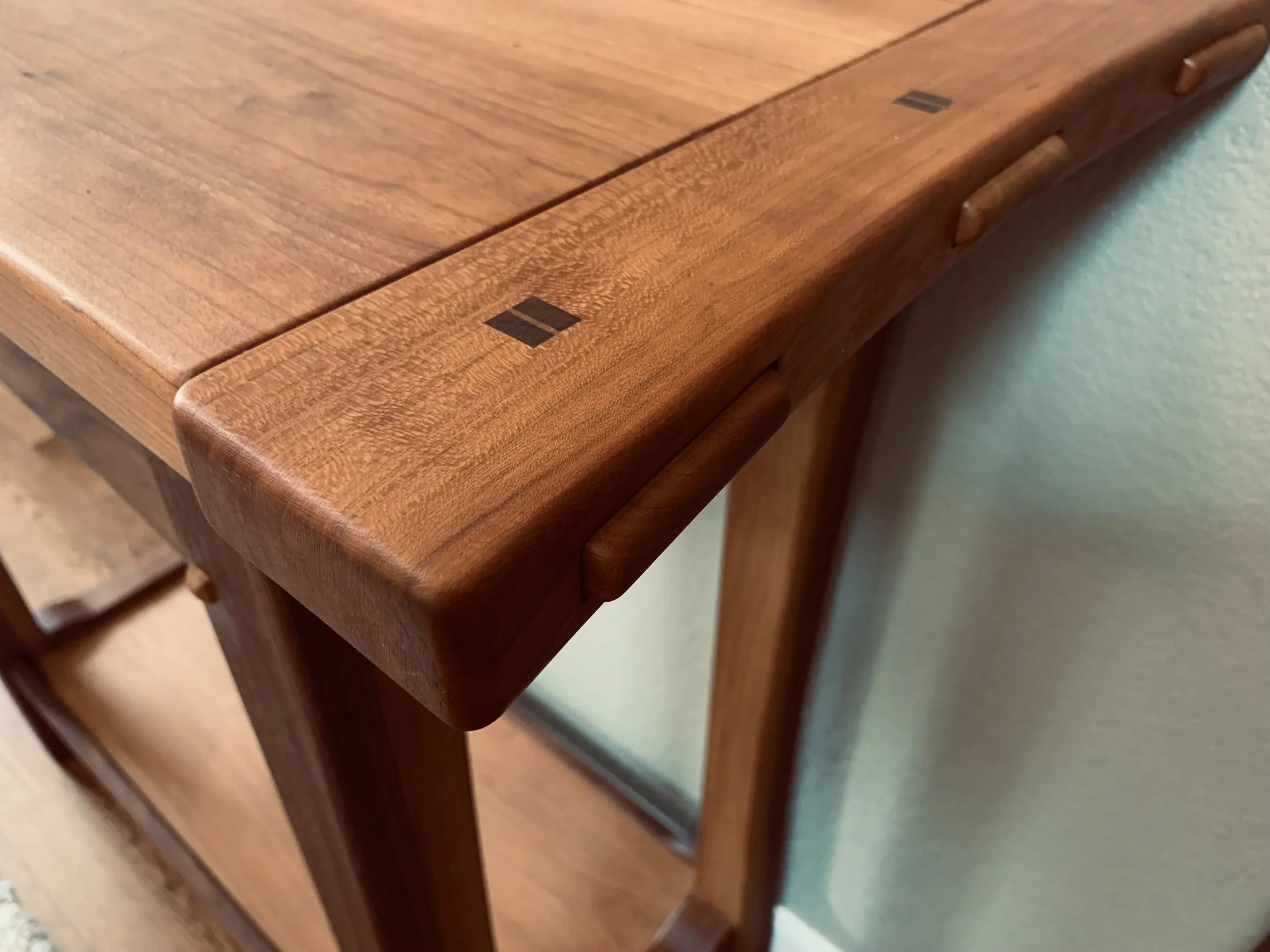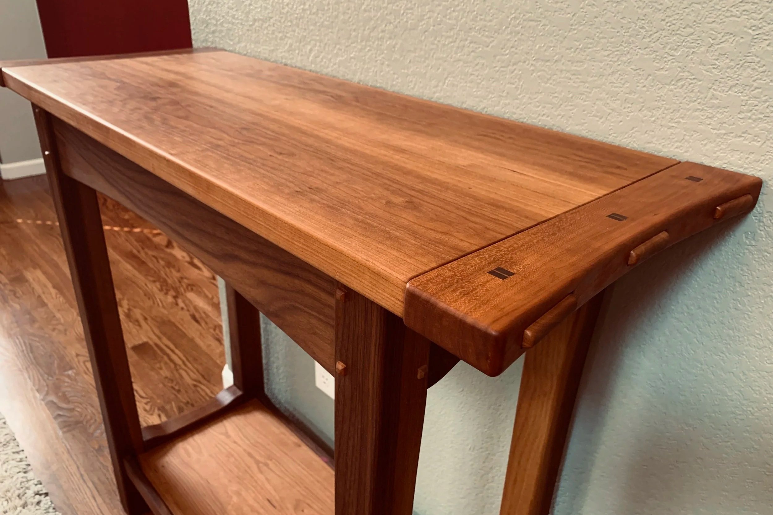 Counter-height entry table of Walnut and Cherry. Breadboard ends with through tenons, pinned & wedged. Sides curve inward with the tenons following the curve.