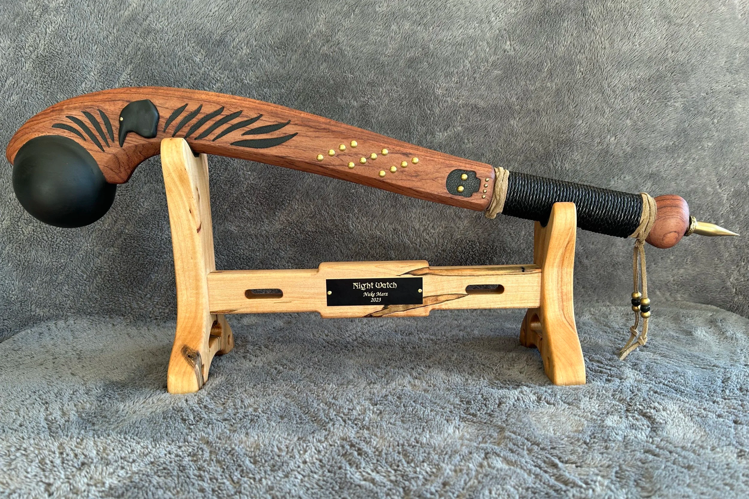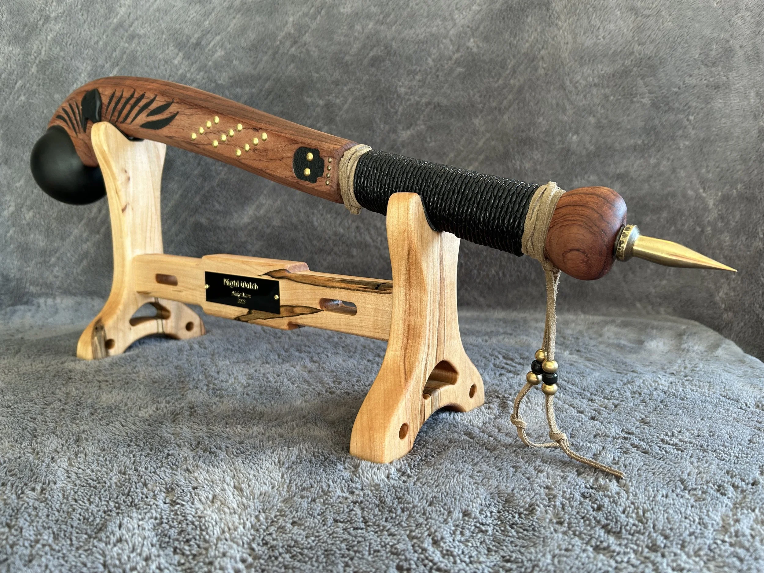 Night Watch is 24" long excluding the 2.2" brass spike. It is accompanied by a custom-made Ghost Maple display stand that is perfectly sized to firmly hold the club, with leather pads at the contact points.