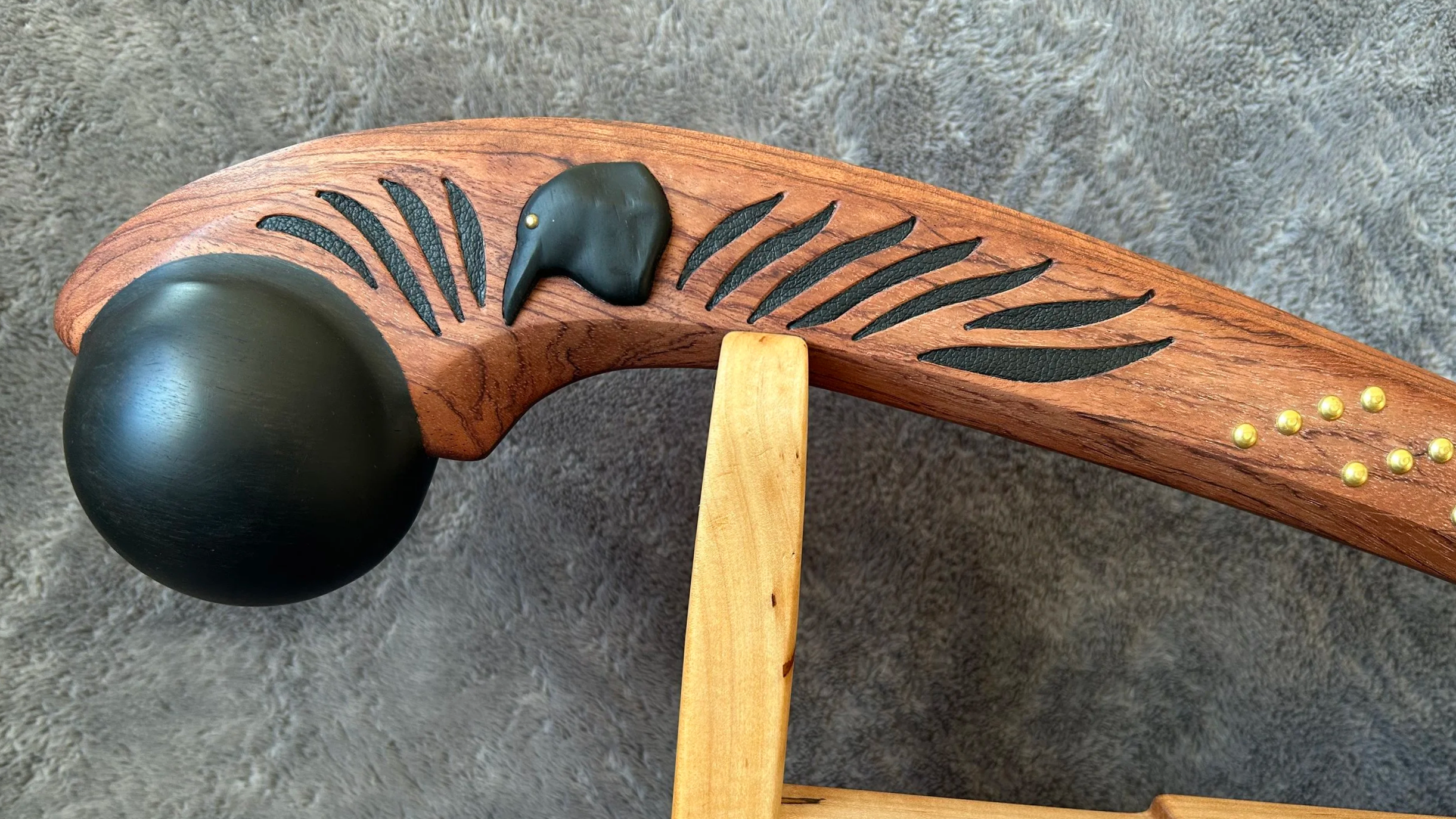 The upper haft is inlaid with a raven head carved of West African Ebony, which is flanked by feather imagery inlaid with premium leather.
