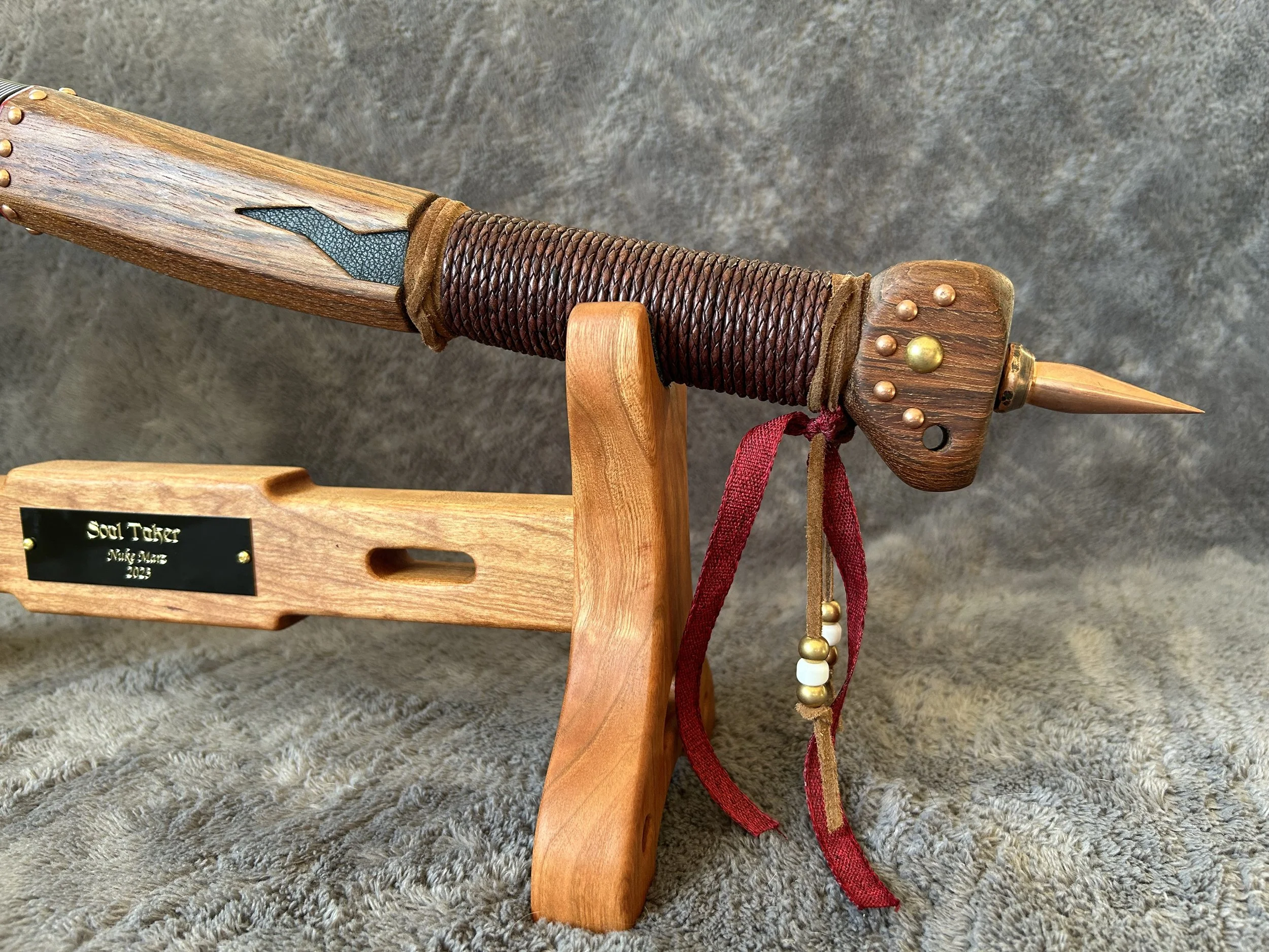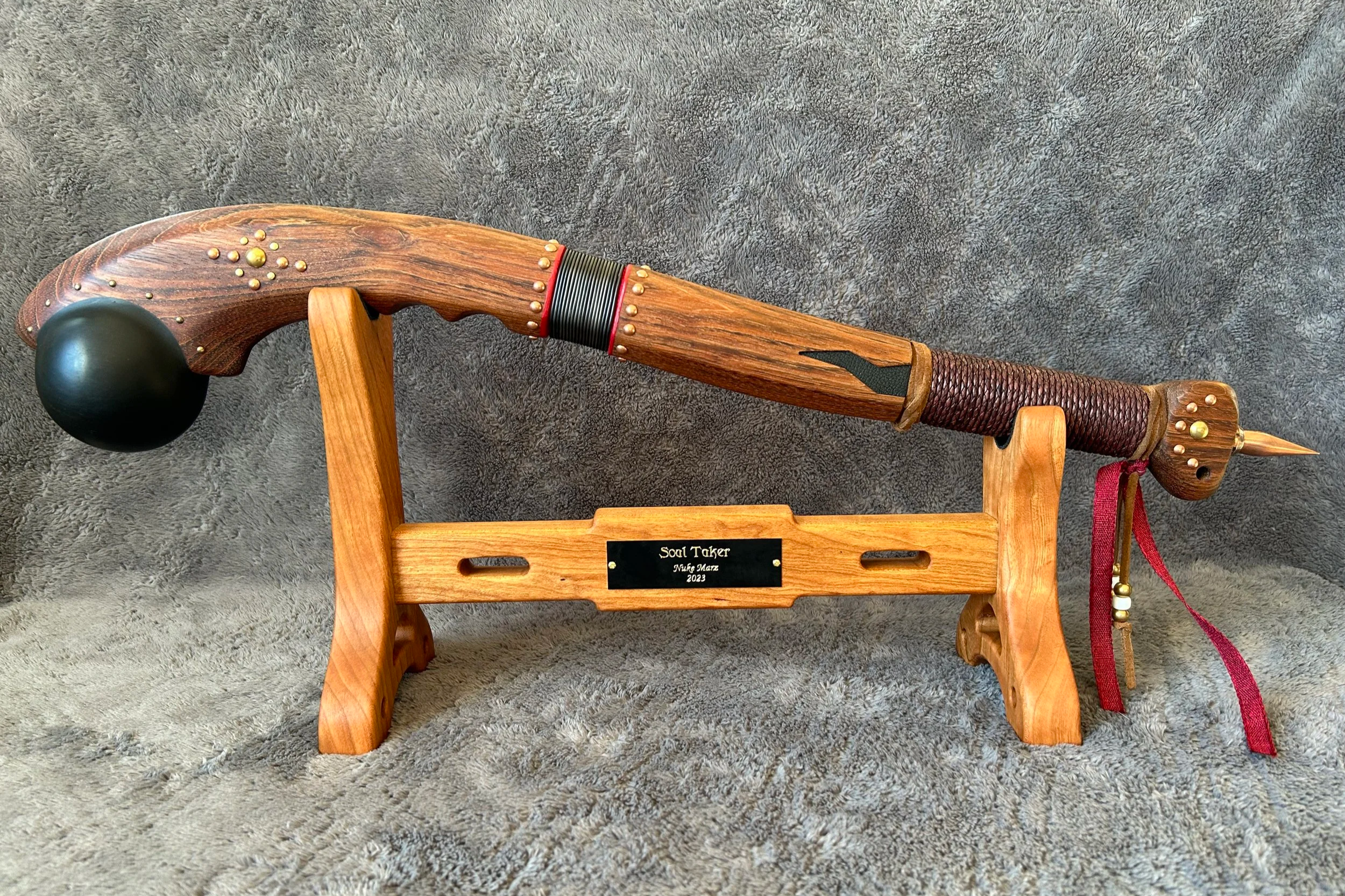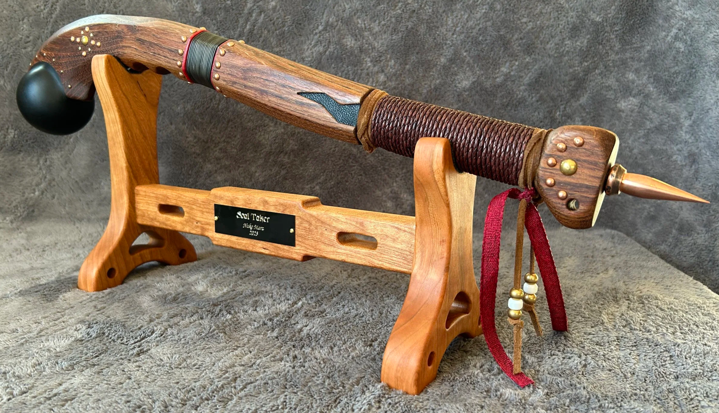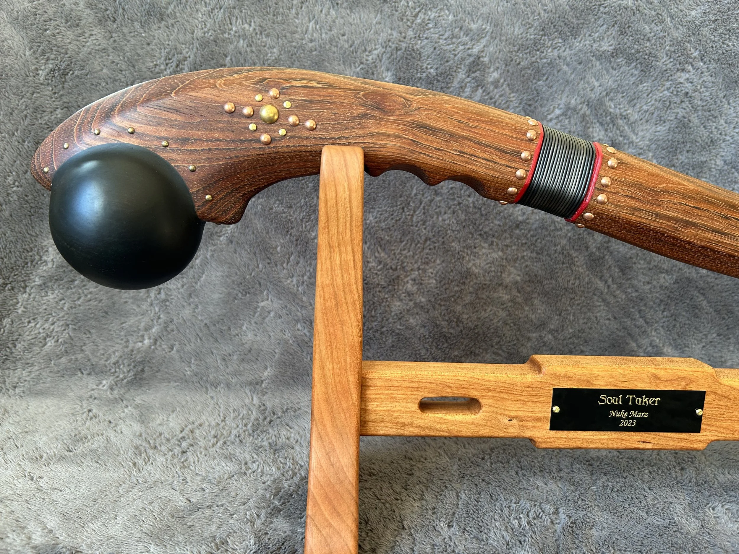 Soul Taker is 23.3" long excluding the 2.1" copper spike. It is accompanied by a custom-made Cherry hardwood display stand that is perfectly sized to firmly hold the club, with leather pads at the contact points.