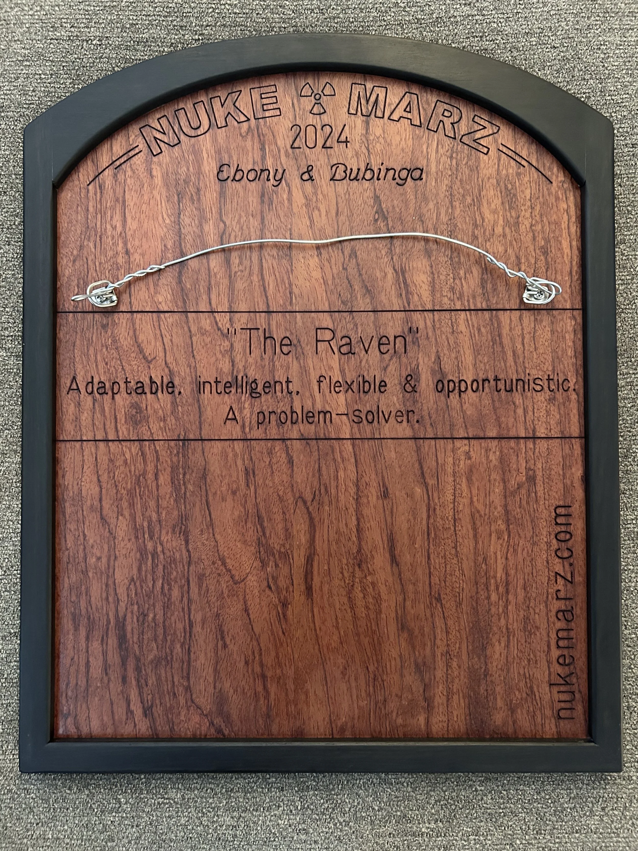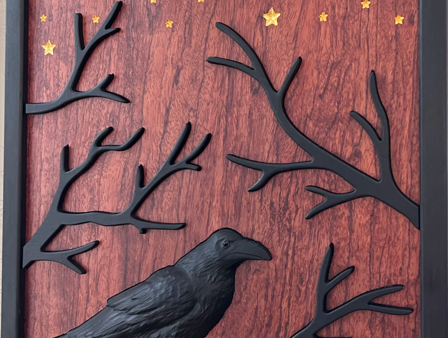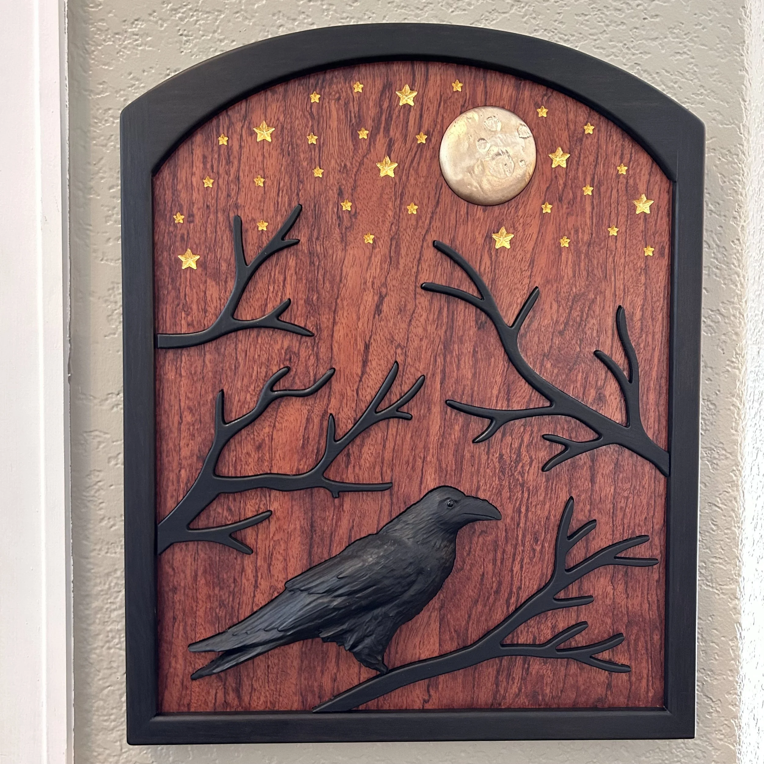 I love adding texture and depth in my work. The carved raven in this piece is inlaid to sit 7/8" proud of the background, while the branches are 3/16" proud and the moon is 3/8" proud.