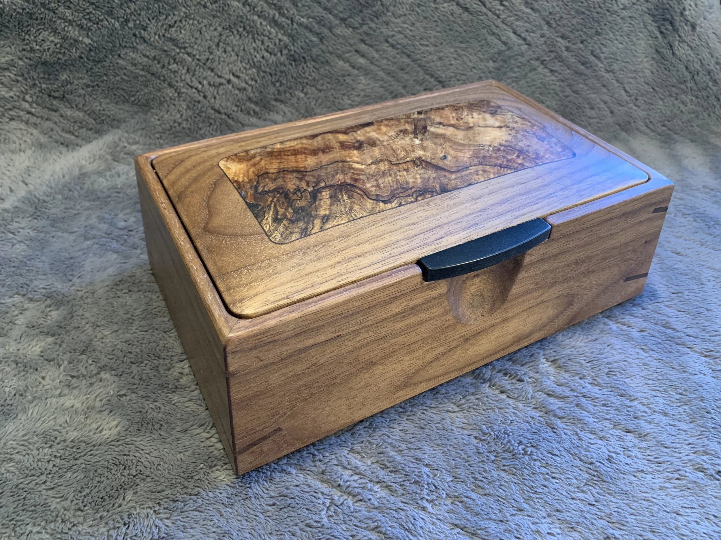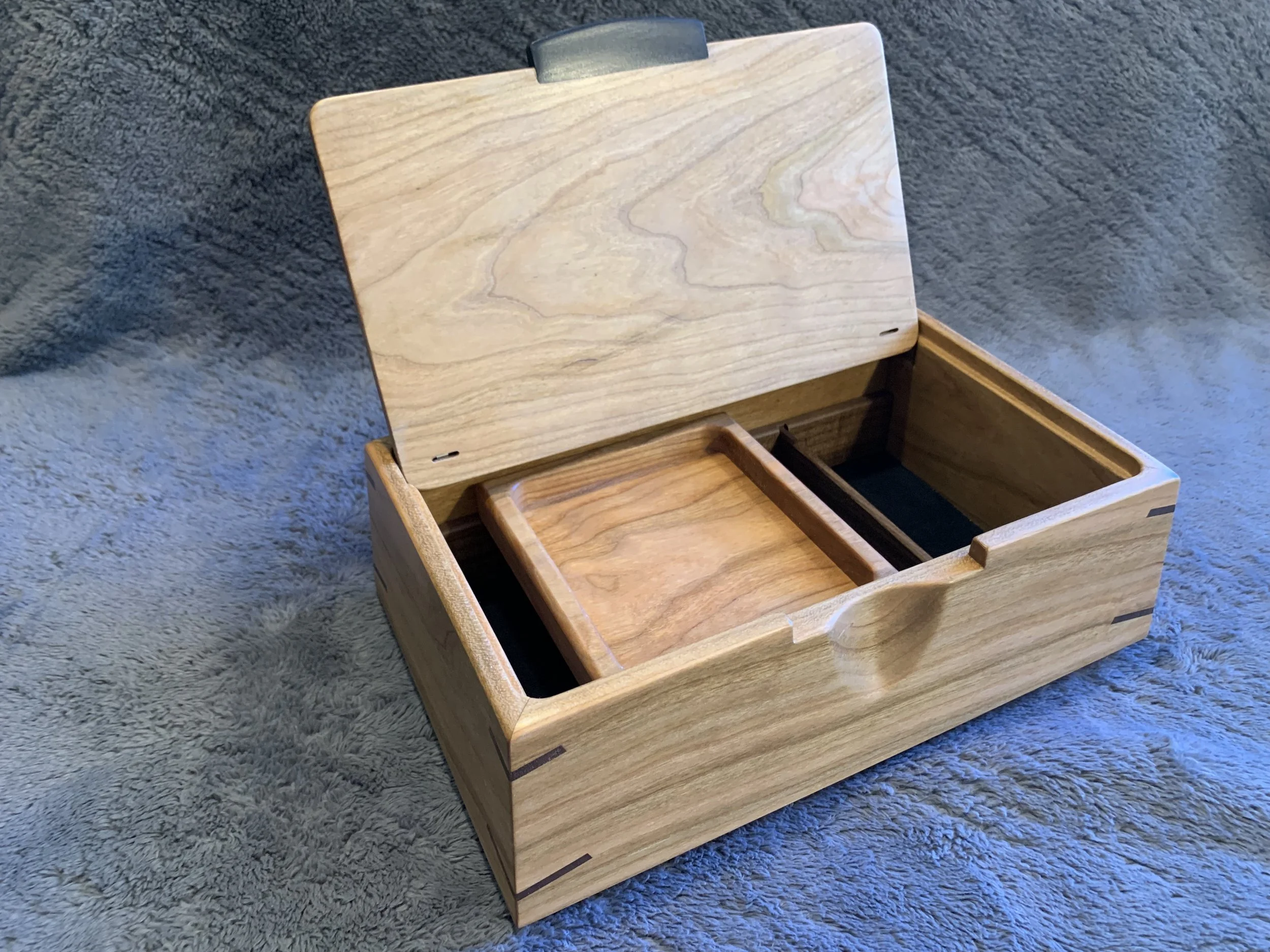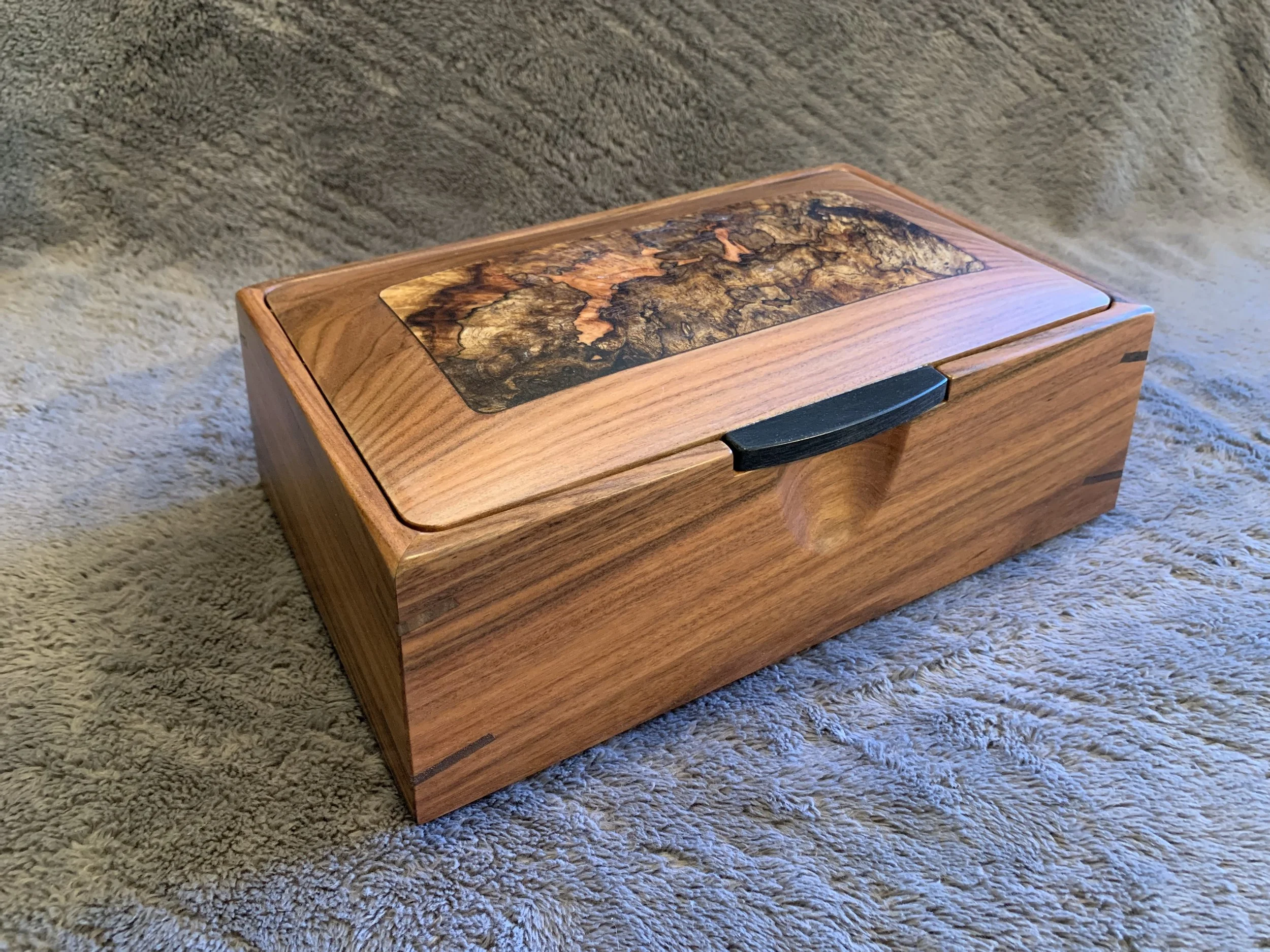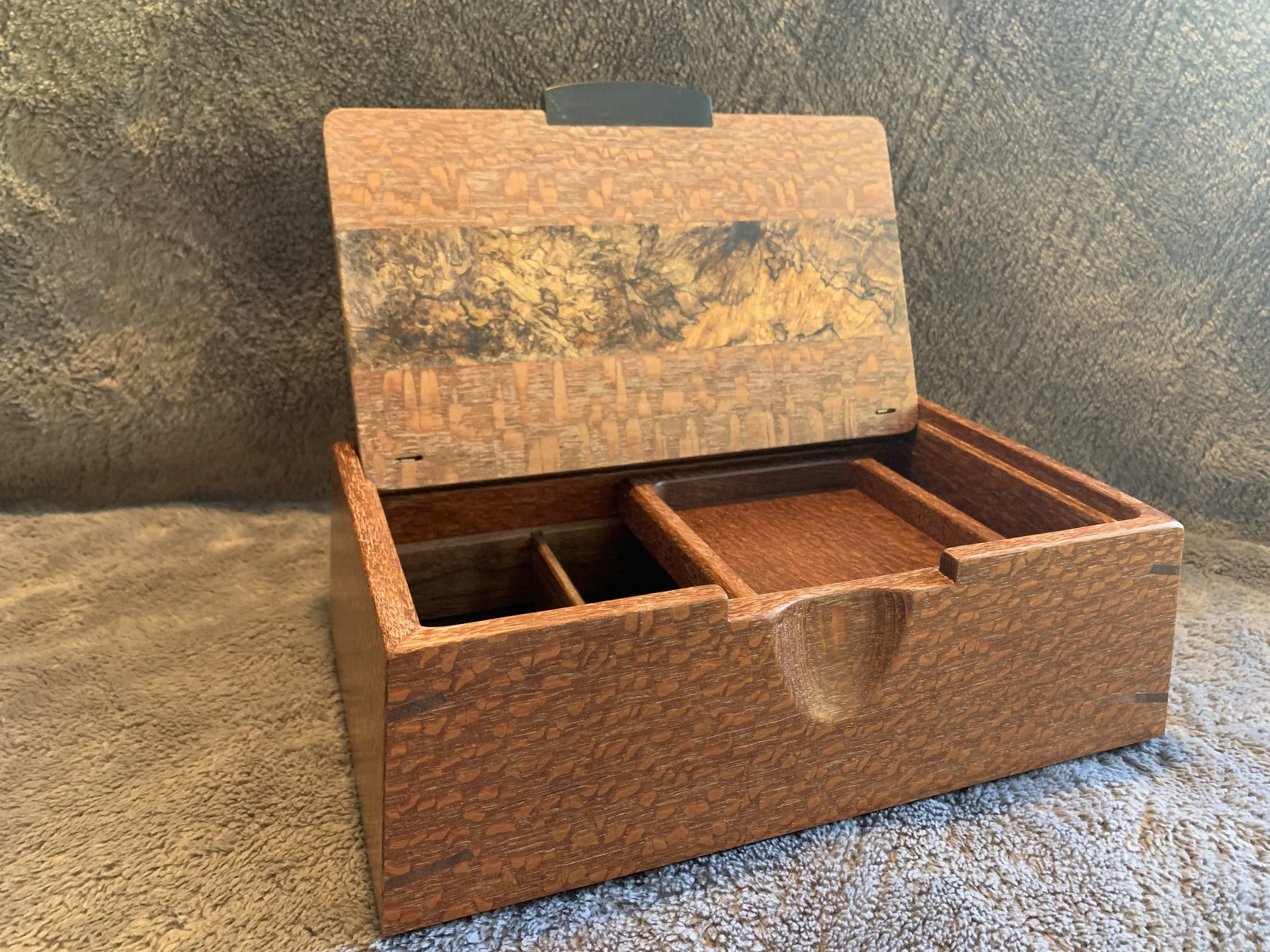 These boxes all feature spectacular Ink-Line Spalted Maple Burl as accent inserts on the lids. The lid pulls are made of Ebony, one of the most prized woods in the world. All four box sides feature a two-way taper and are joined with mitered corners that are reinforced with Walnut splines. The lid sits inside the box, with a hidden hinge. The front of the box has a carved recess for easy opening. The inside of the box is divided into sections with a tray resting on top. The bottom of the box is lined with Ultrasuede.