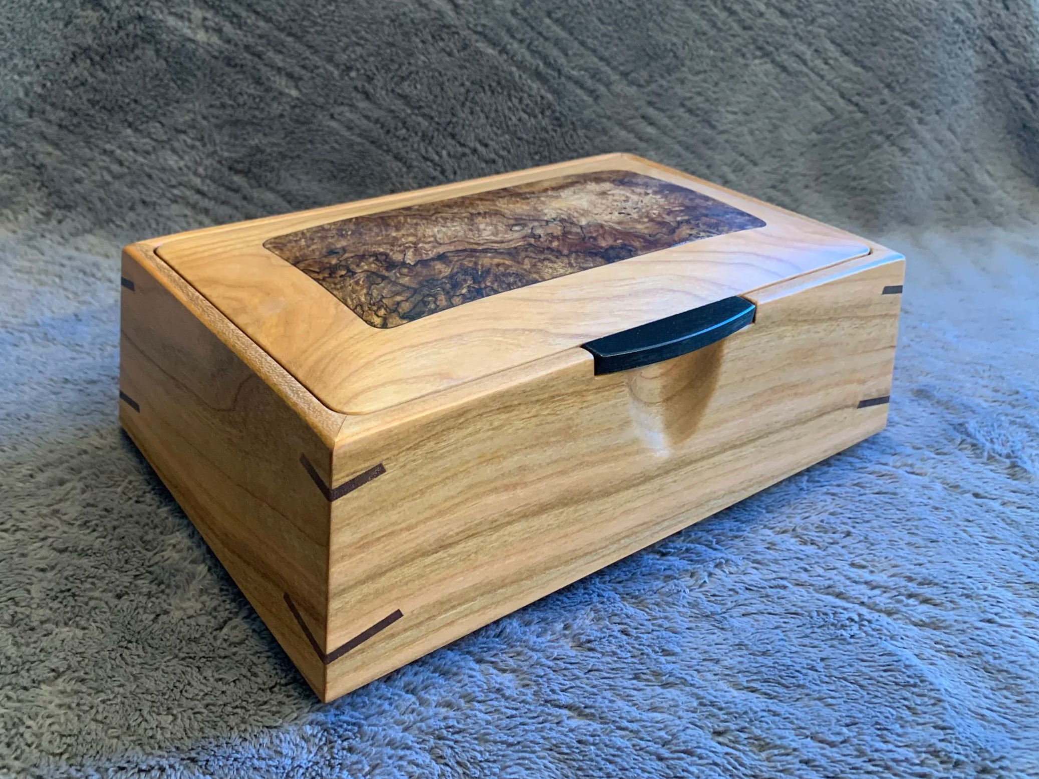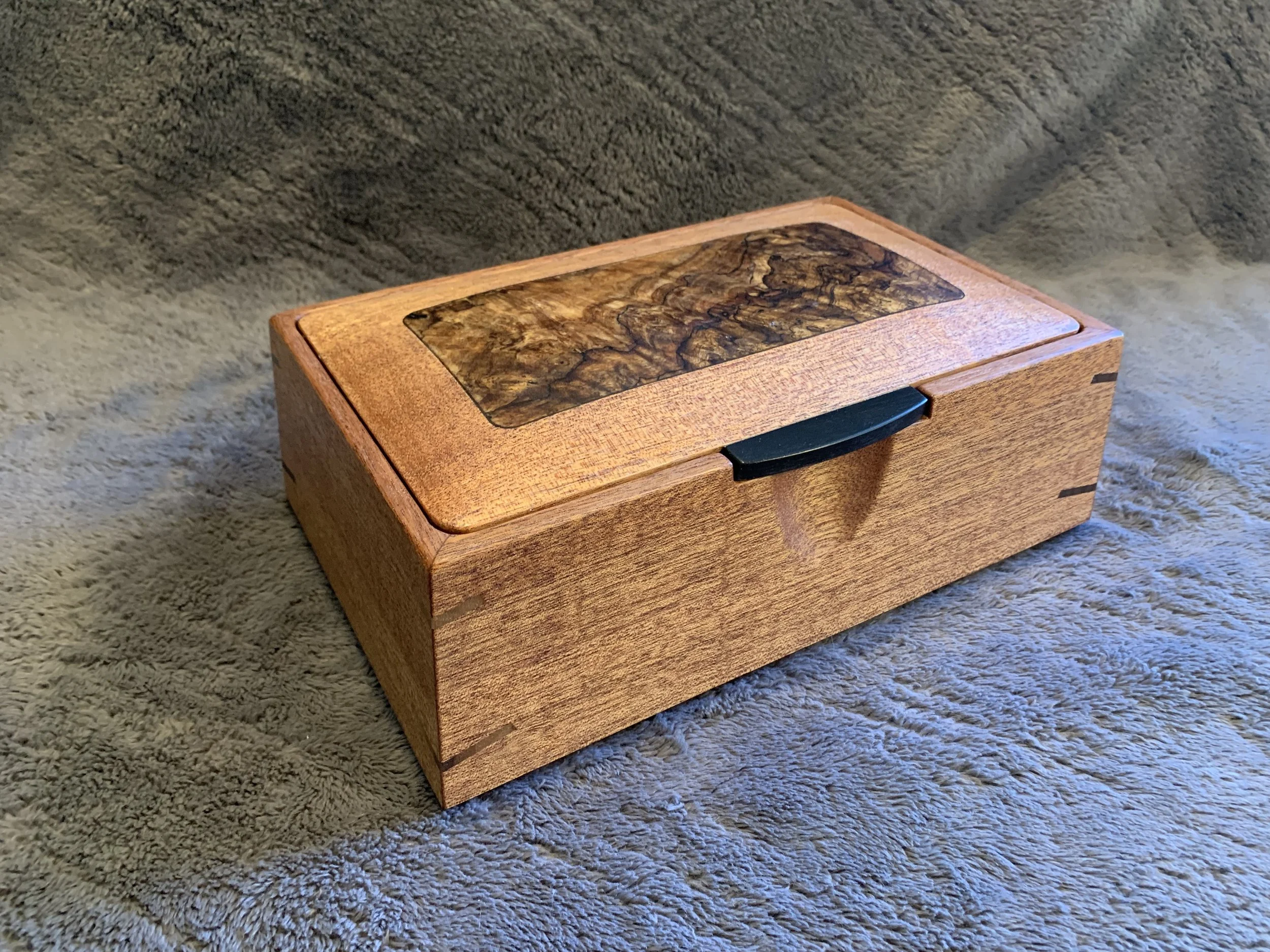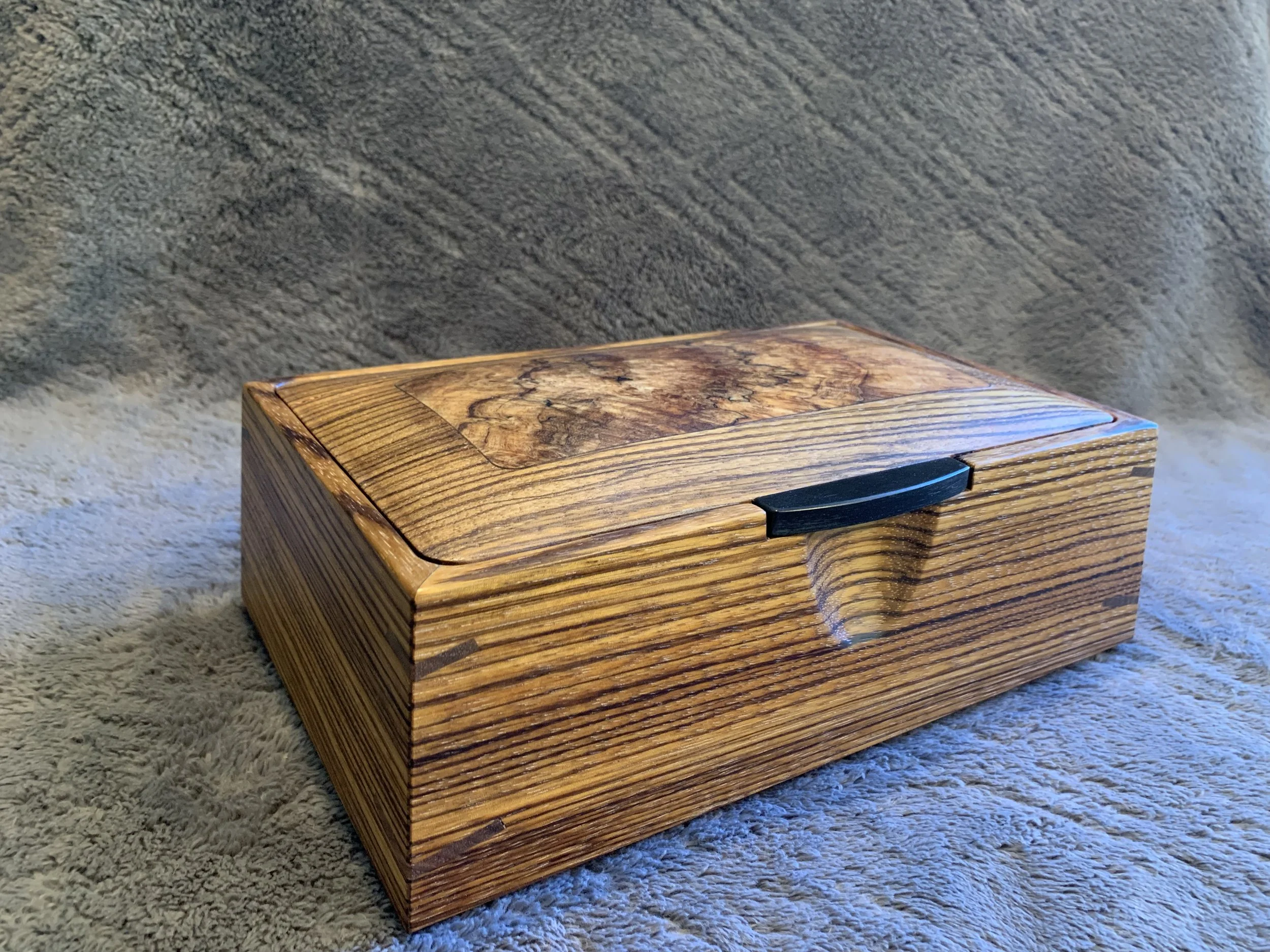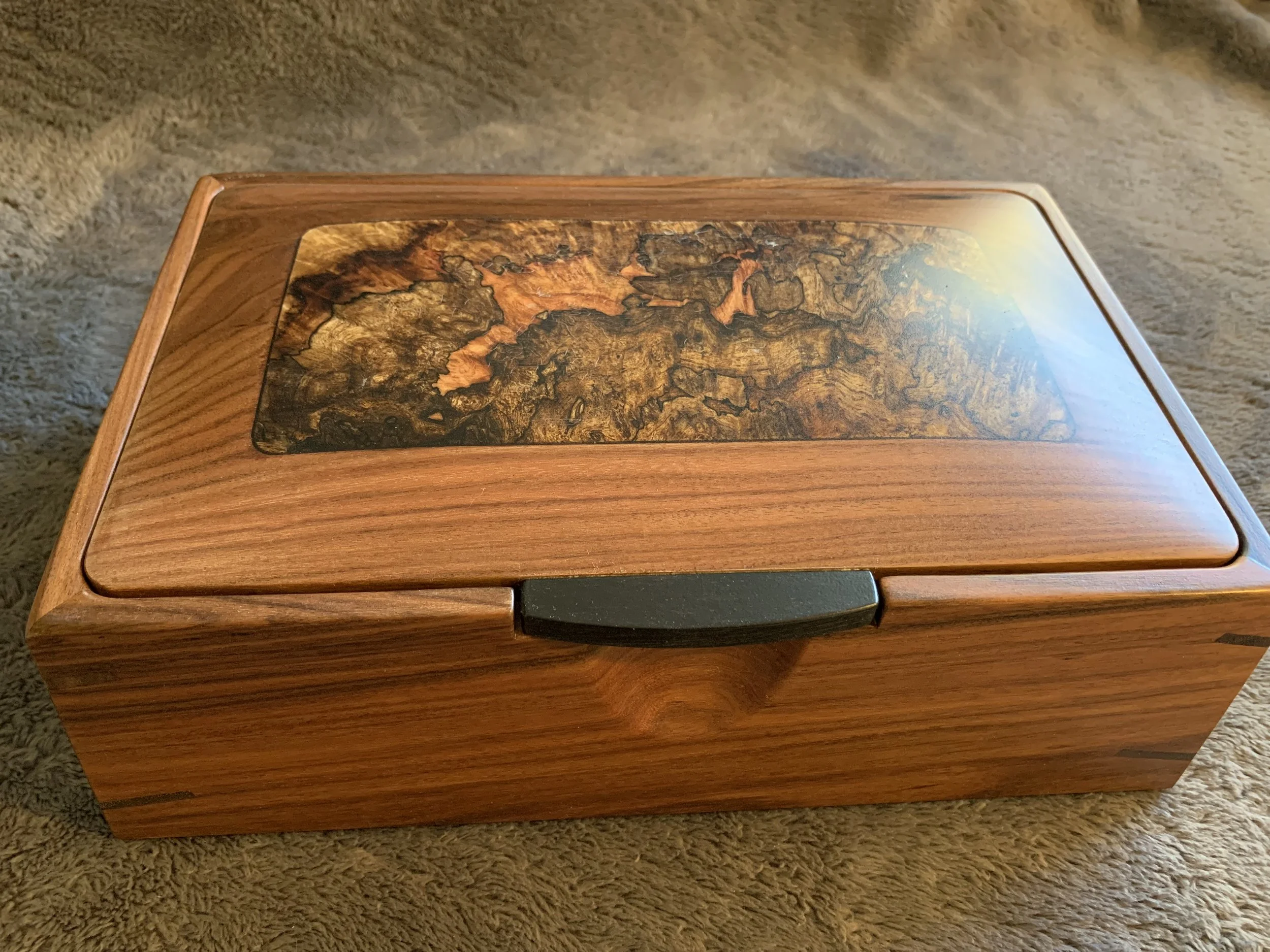 These boxes all feature spectacular Ink-Line Spalted Maple Burl as accent inserts on the lids. The lid pulls are made of Ebony, one of the most prized woods in the world. All four box sides feature a two-way taper and are joined with mitered corners that are reinforced with Walnut splines. The lid sits inside the box, with a hidden hinge. The front of the box has a carved recess for easy opening. The inside of the box is divided into sections with a tray resting on top. The bottom of the box is lined with Ultrasuede.