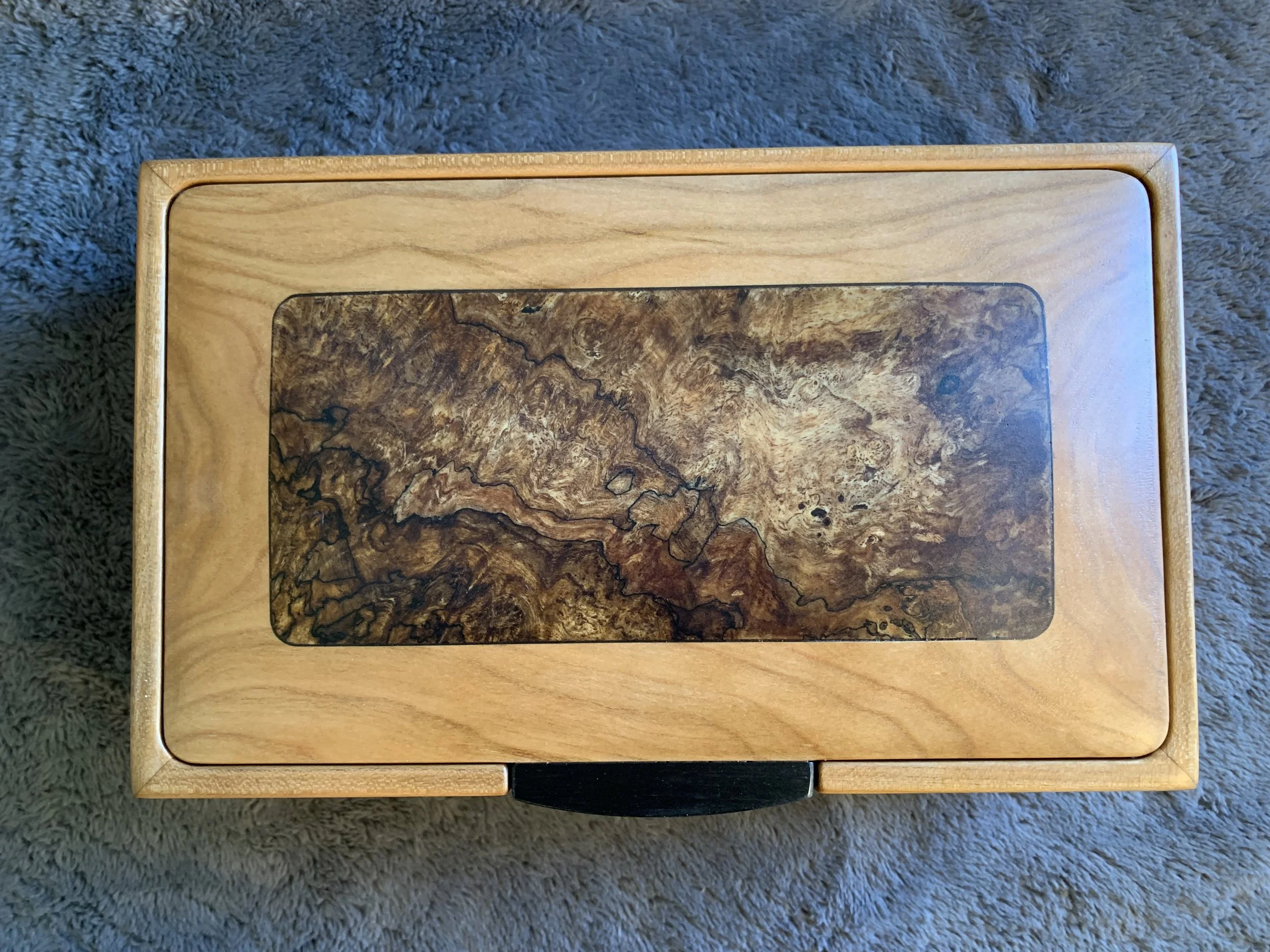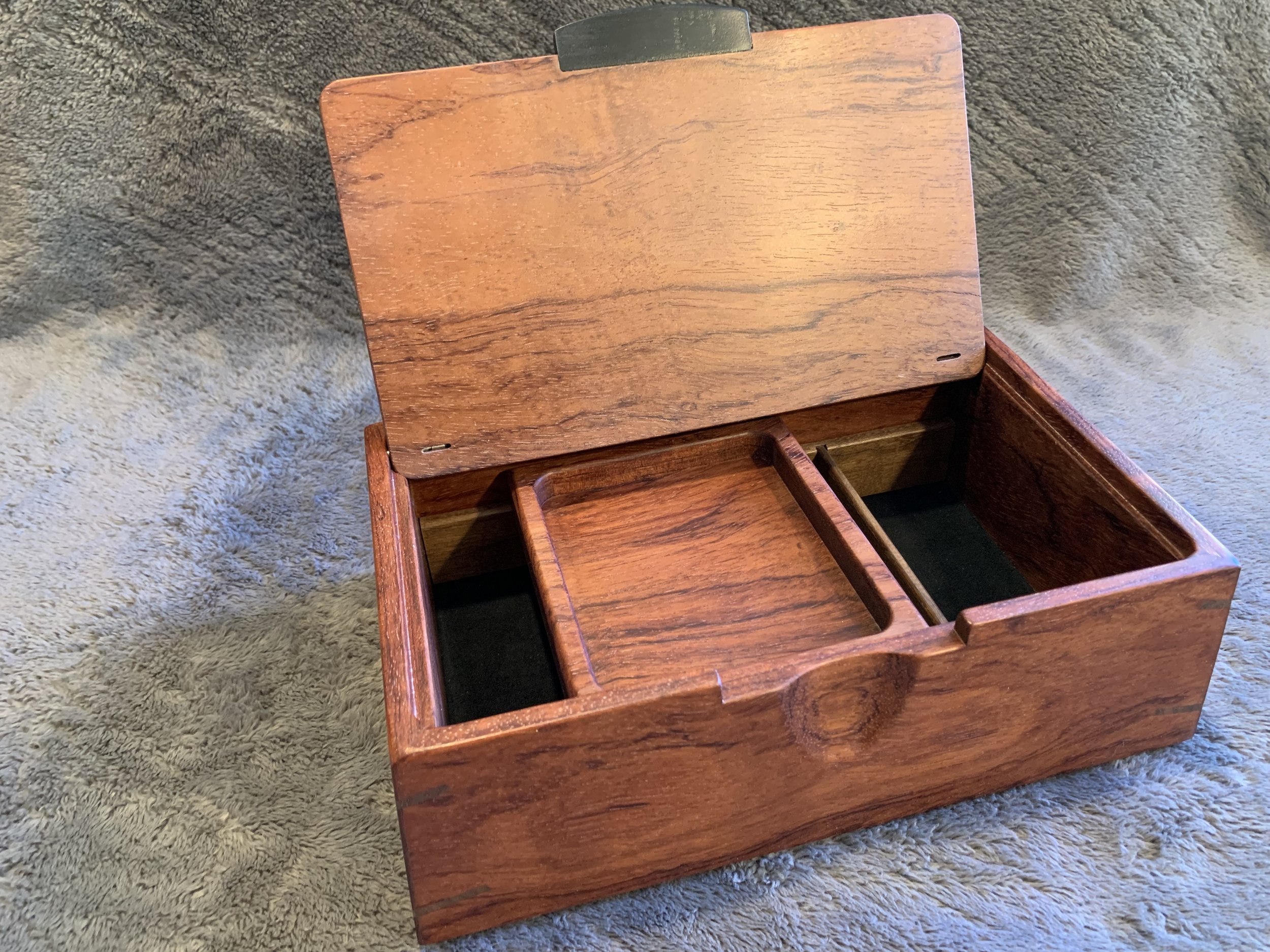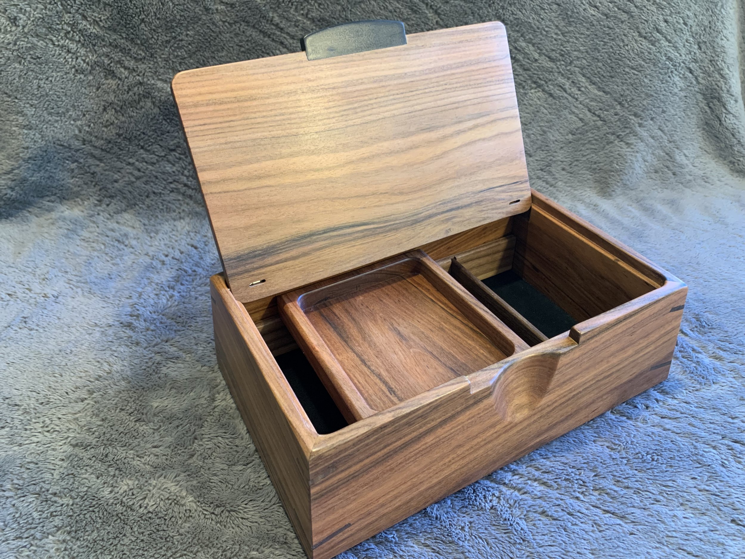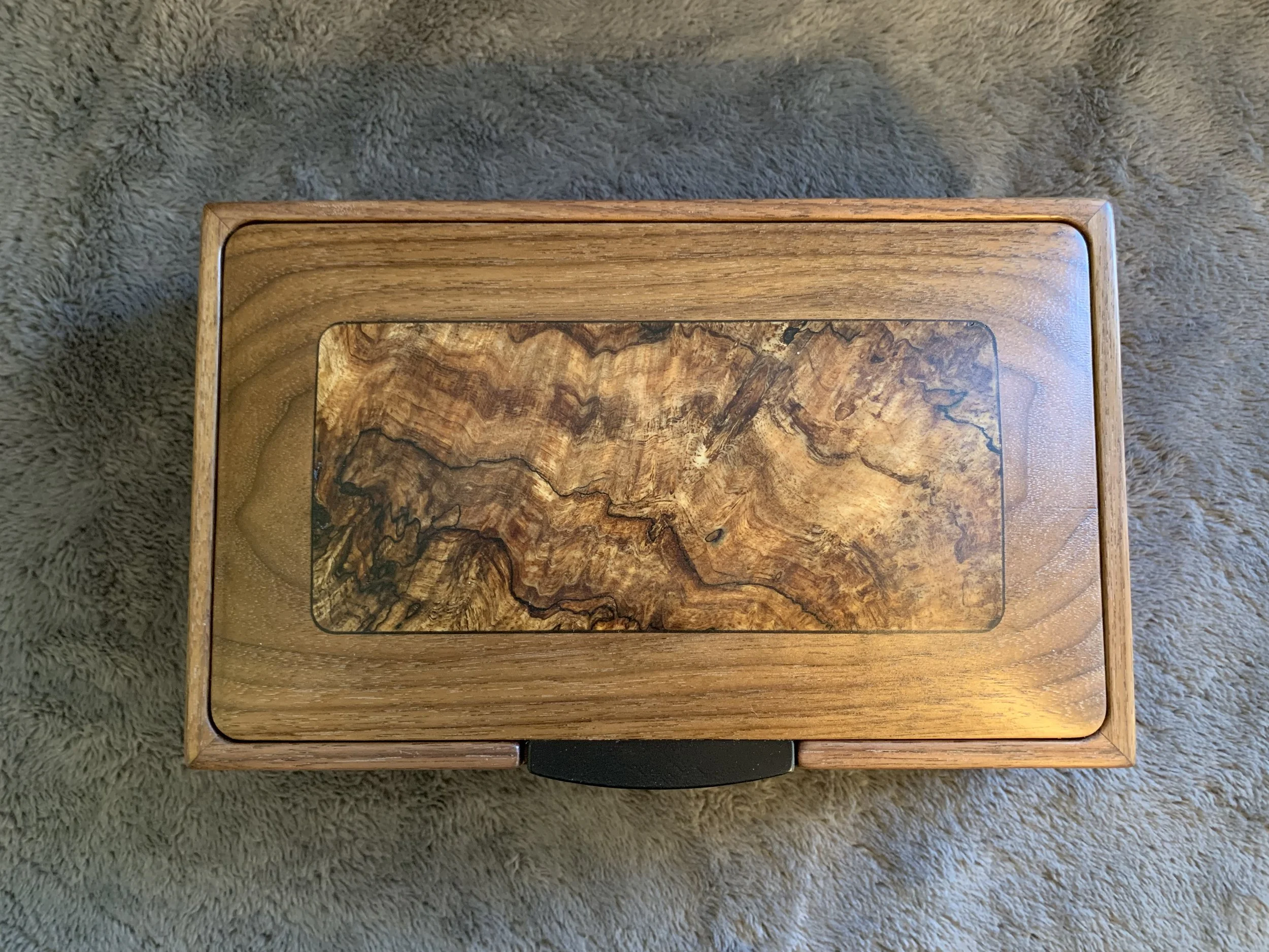 These boxes all feature spectacular Ink-Line Spalted Maple Burl as accent inserts on the lids. The lid pulls are made of Ebony, one of the most prized woods in the world. All four box sides feature a two-way taper and are joined with mitered corners that are reinforced with Walnut splines. The lid sits inside the box, with a hidden hinge. The front of the box has a carved recess for easy opening. The inside of the box is divided into sections with a tray resting on top. The bottom of the box is lined with Ultrasuede.