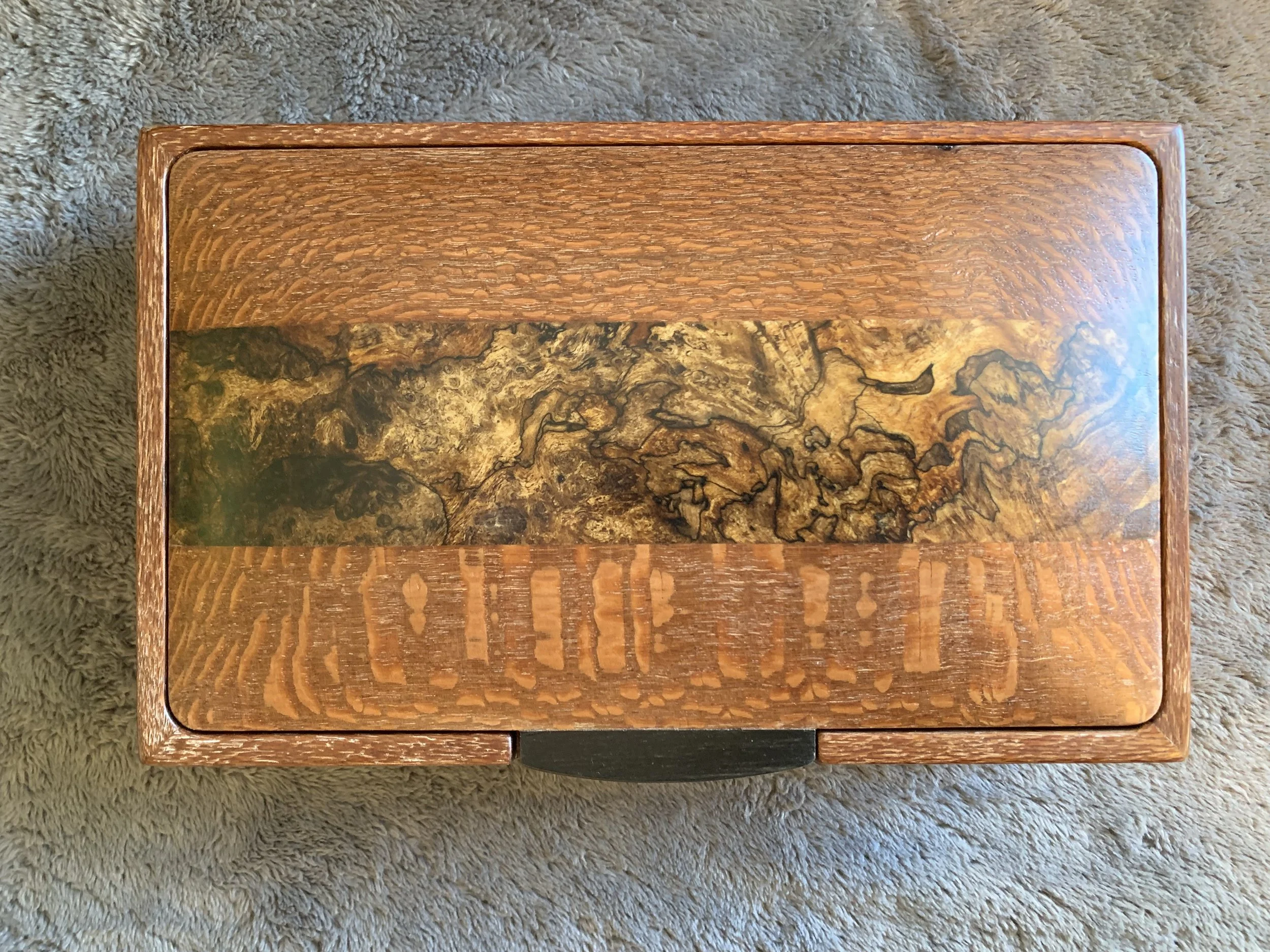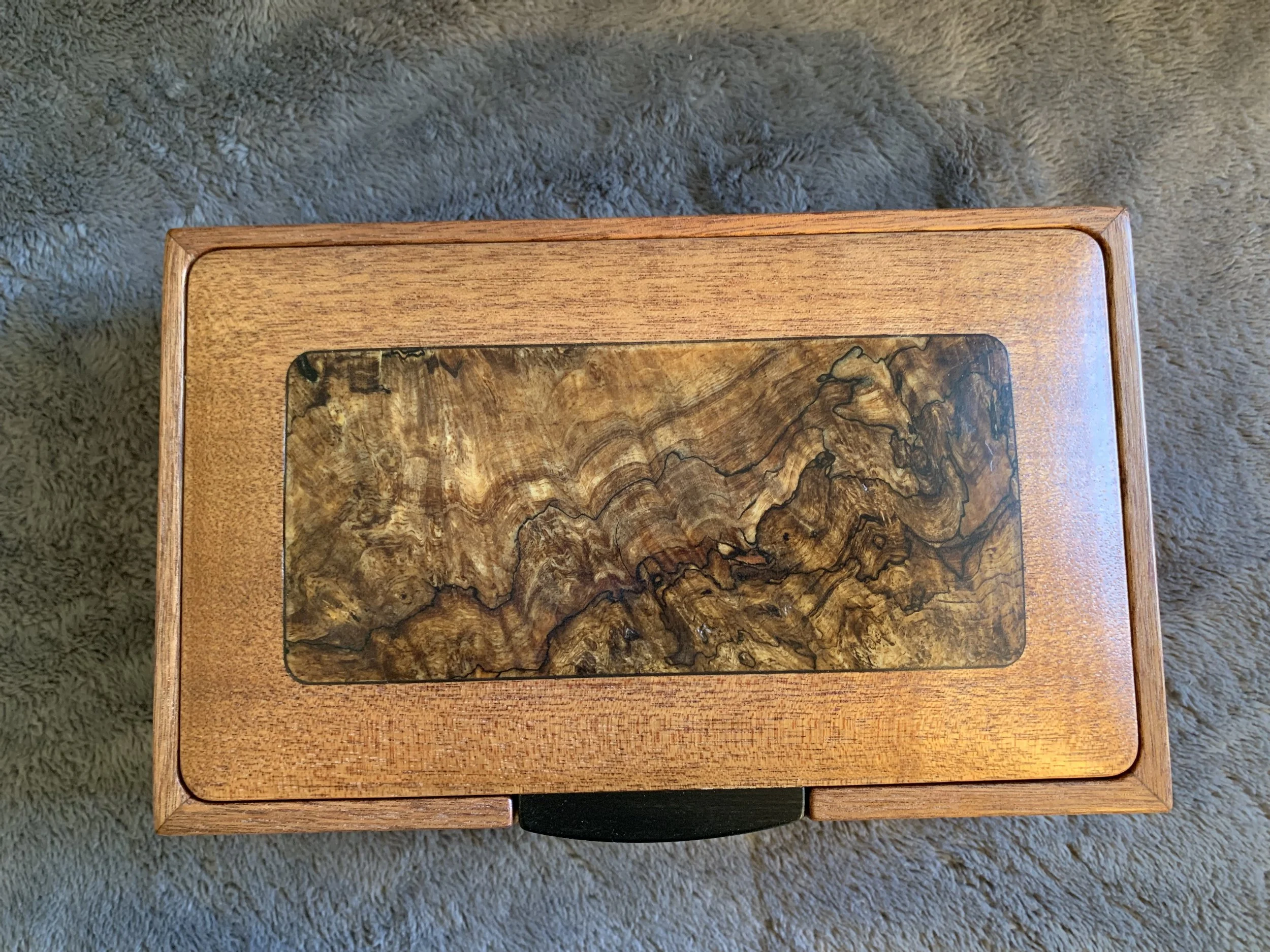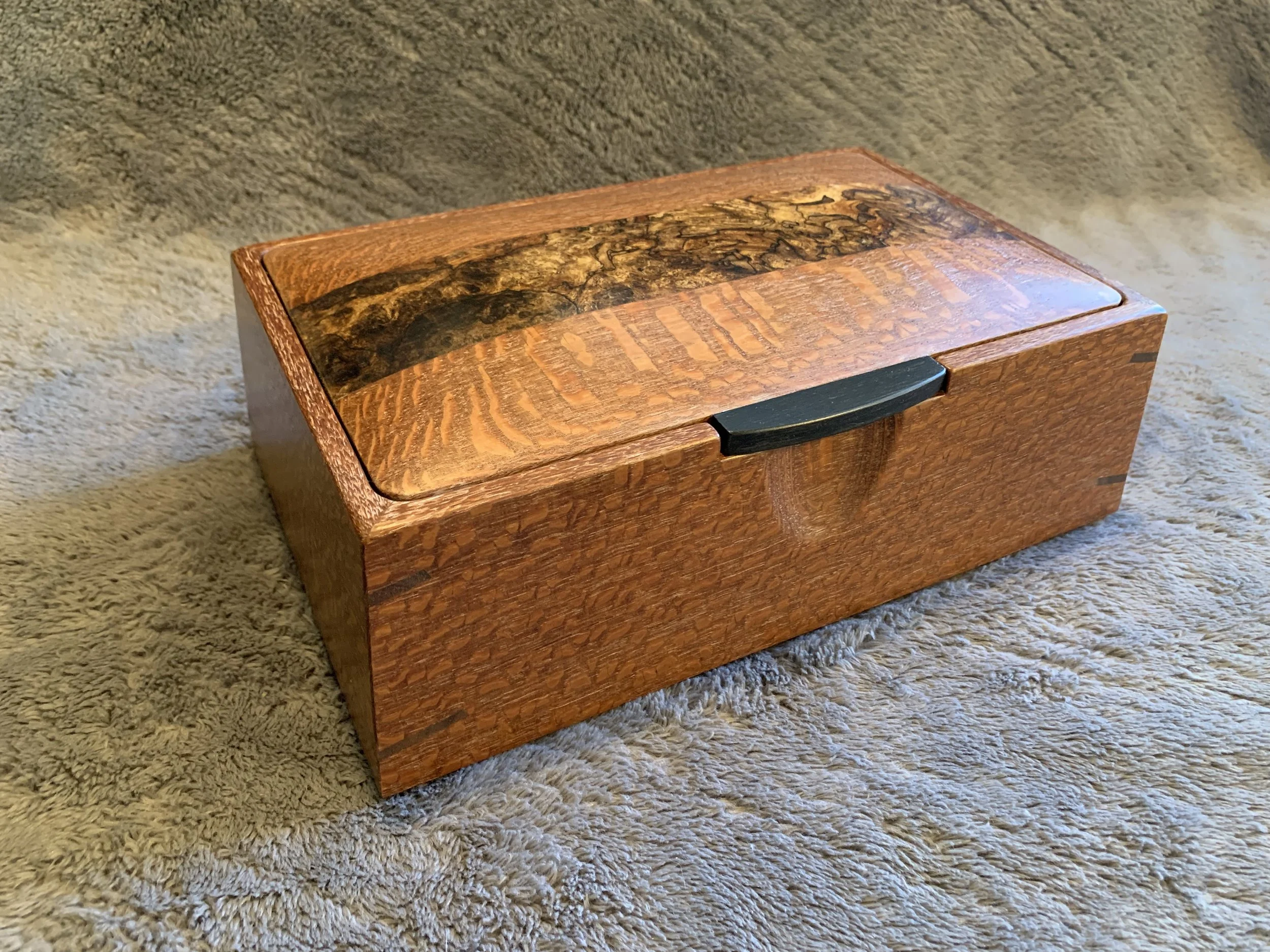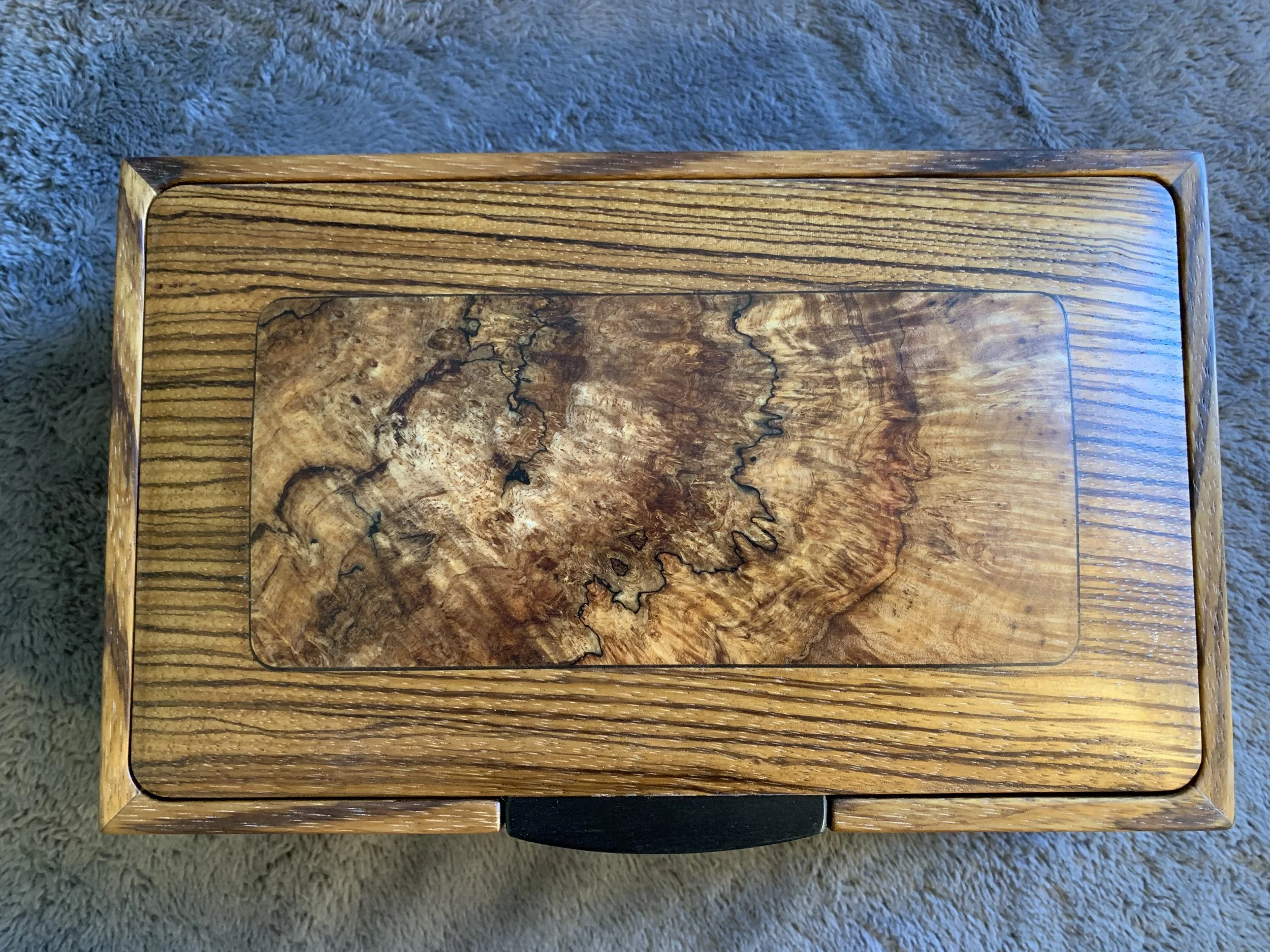 These boxes all feature spectacular Ink-Line Spalted Maple Burl as accent inserts on the lids. The lid pulls are made of Ebony, one of the most prized woods in the world. All four box sides feature a two-way taper and are joined with mitered corners that are reinforced with Walnut splines. The lid sits inside the box, with a hidden hinge. The front of the box has a carved recess for easy opening. The inside of the box is divided into sections with a tray resting on top. The bottom of the box is lined with Ultrasuede.